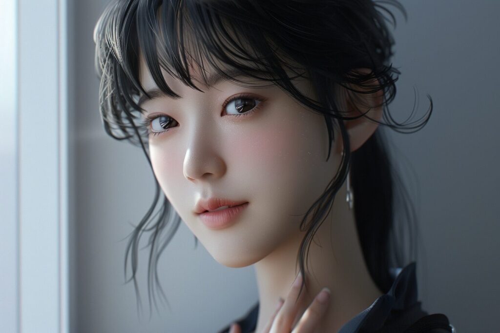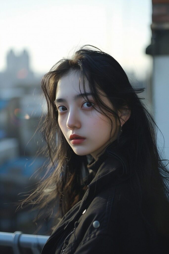 17-year-old Korean beauty, (wide shot: 1.8), (beautiful:1.8), (Japanese: 1.4), (ultra detailed:2.0), (Cinematic fade: 1.1), (the whole body: 2.0), (RAW photo, best quality), (realistic),photo, best quality ,masterpiece, an extremely delicate and beautiful, extremely detailed, CG ,unity, 2k wallpaper, finely detail, masterpiece, best quality, huge filesize, ultra-detailed, highres, extremely detailed, ((1girl)), ((solo)), slim body,(talkthattalkoutfit), hand in nape, smile, portrait,porcelain skin, belt, black hair, ponytail, bangs, black jacket, black shirt, realistic, extremely detailed face, extremely detailed eyes, twmina, minari,<lora:xelors_TwiceMina_v2.0:0.85>, --ar 3:2