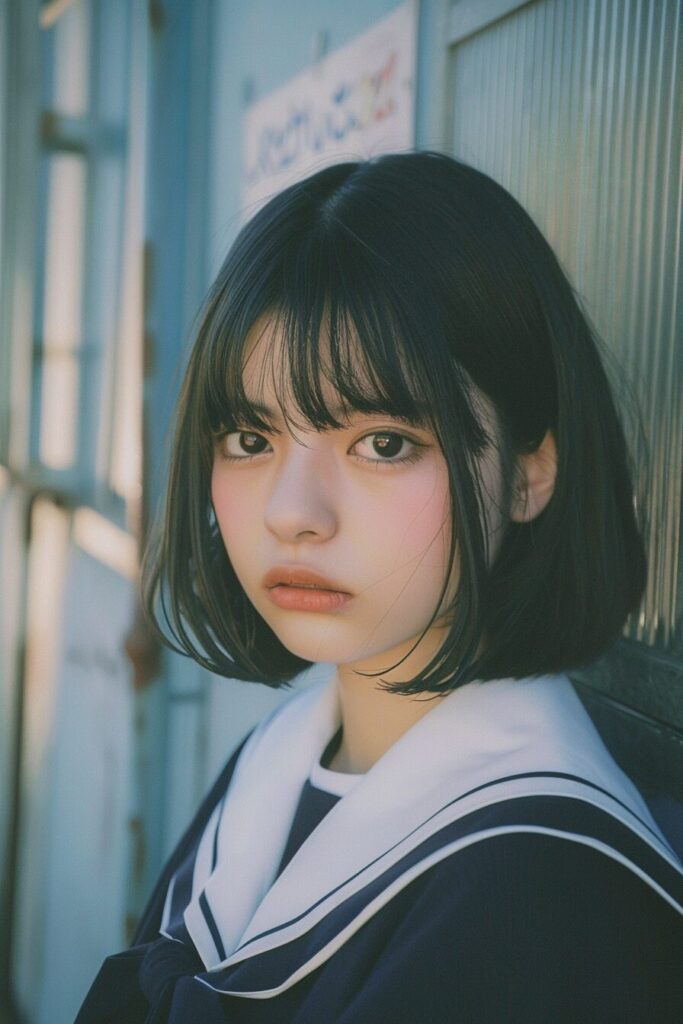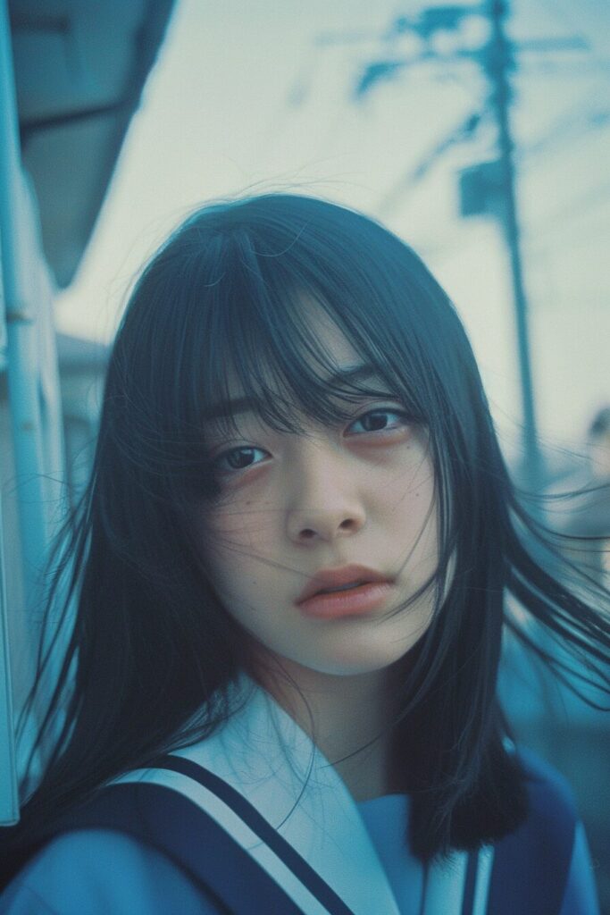 18-year-old Japanese beauty, (wide shot: 1.8), (beautiful:1.8), (Japanese: 1.4), (ultra detailed:2.0), (Cinematic fade: 1.1), (the whole body: 2.0), instax, snapshot, Realistic, Photography, jpop girl group's girl, Japanese-idol-face girl, A girl with a face like a beautiful anime cosplayer, 17-years-old, kawaii, Japanese sailor school uniform, black hair, straight hair, Lomography, blue and white, cinematic shot, dynamic pose, dynamic angle, in the style of y2k aesthetic, --ar 2:3