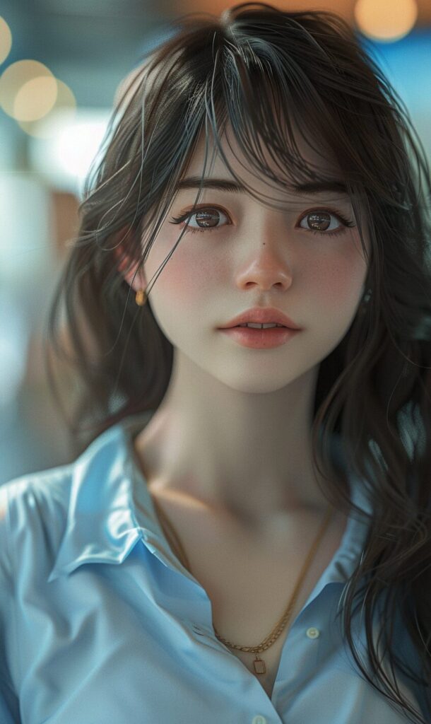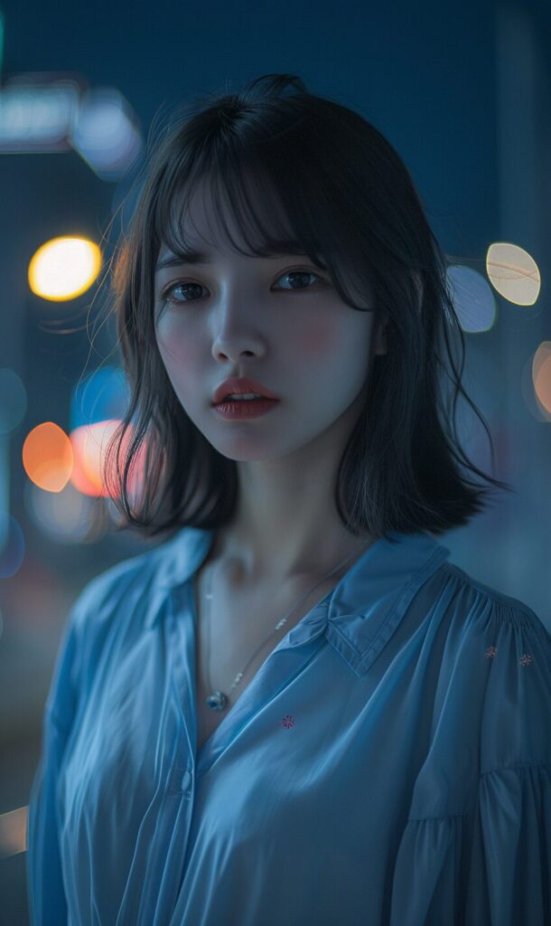 16-year-old Japanese beauty, (wide shot: 1.8), (beautiful:1.8), (Japanese: 1.4), (ultra detailed:2.0), (Cinematic fade: 1.1), (the whole body: 2.0), 1girl,(wearing a blue blouse:1.2),(RAW photo, best quality), (realistic, photo-realistic:1.4), masterpiece, an extremely delicate and beautiful, extremely detailed, 2k wallpaper, Amazing, finely detail, extremely detailed CG unity 8k wallpaper, ultra-detailed, highres, soft light, beautiful detailed girl, extremely detailed eyes and face, beautiful detailed nose, beautiful detailed eyes,cinematic lighting,city lights at night,perfect anatomy,slender body,smiling, --ar 3:5