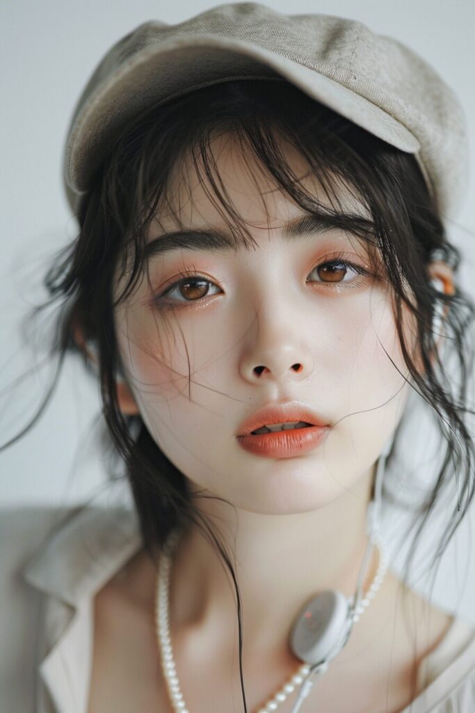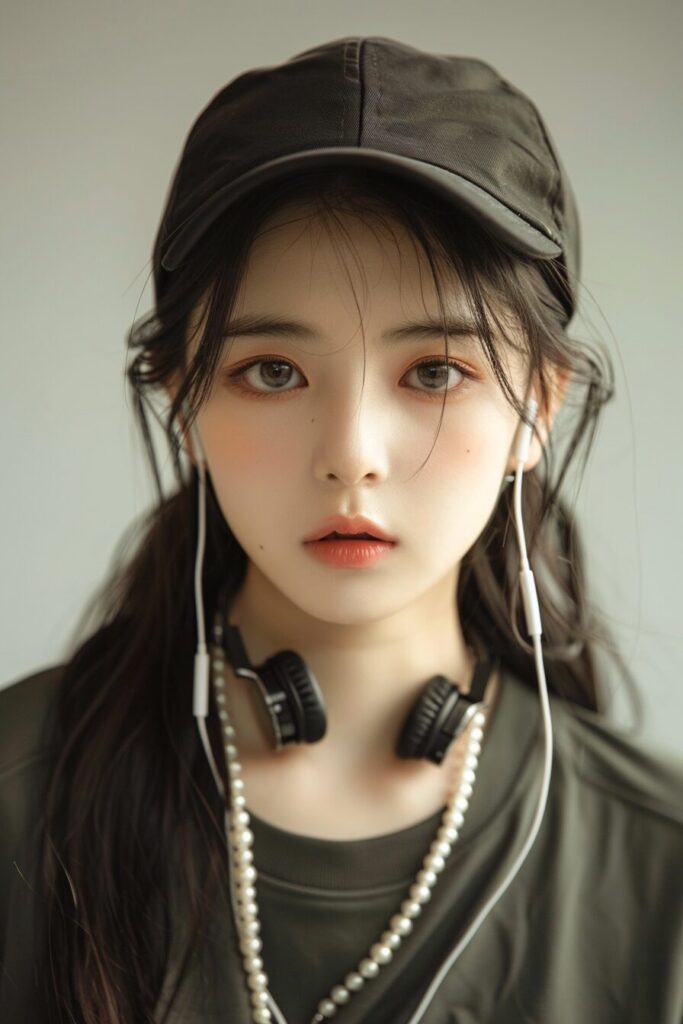 18-year-old Korean beauty, (wide shot: 1.8), (beautiful:1.8), (Japanese: 1.4), (ultra detailed:2.0), (Cinematic fade: 1.1), (the whole body: 2.0), A handsome Japanese 20-year-old girl with a cap on her head ,headphones around her neck , half-length photo, facing the audience directly, symmetrical facial close-up, facing the audience head-on, wearing modern and stylish sportswear, art clothes, pearls, H. R. Giger, white background, --ar 2:3