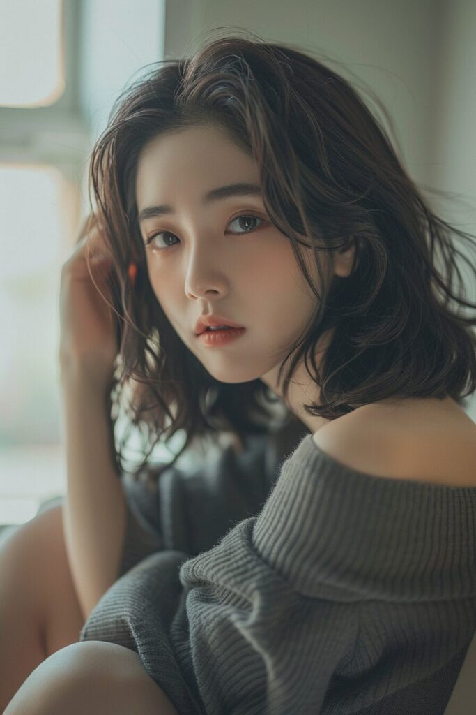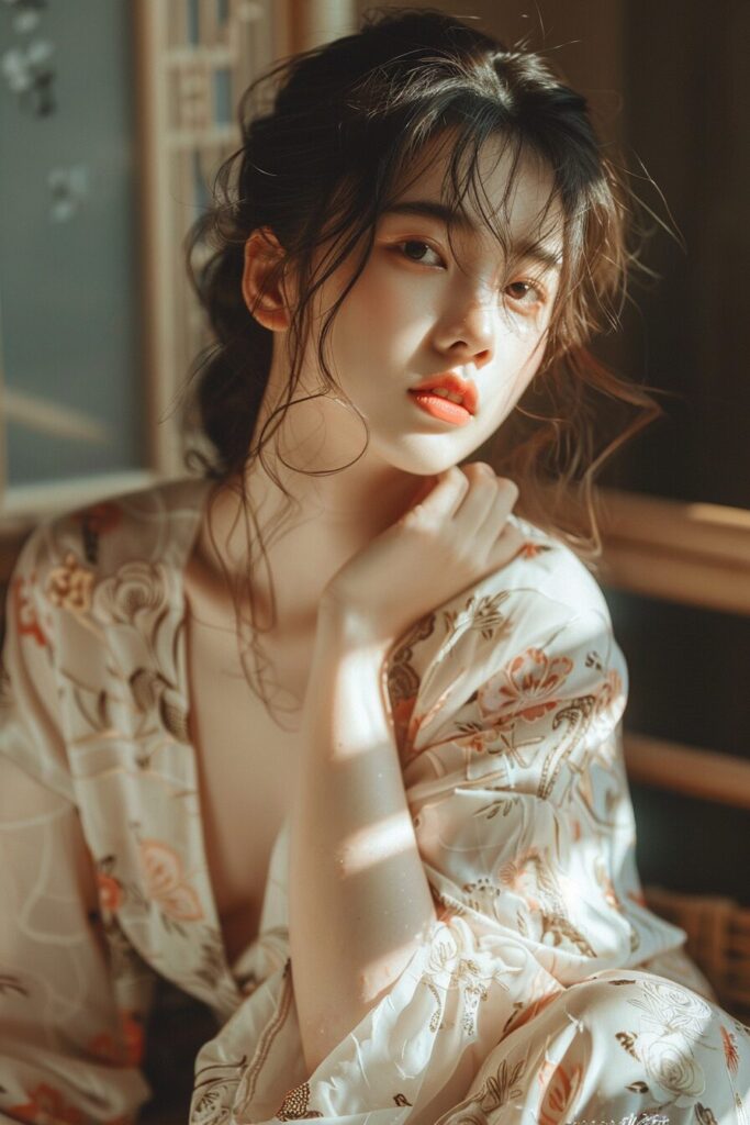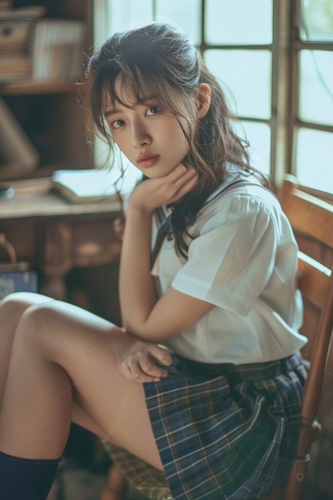 20-year-old Chinese beauty, (wide shot: 1.8), (beautiful:1.8), (Japanese: 1.4), (ultra detailed:2.0), (Cinematic fade: 1.1), (the whole body: 2.0), 22w 2020s fashion, full body of a 20-year-old Japanese beauty sitting, snapshot not looking at the camera, double and big eyes, face is downcast, beautiful thighs, --ar 2:3