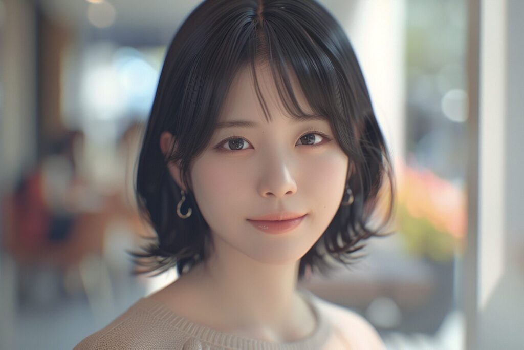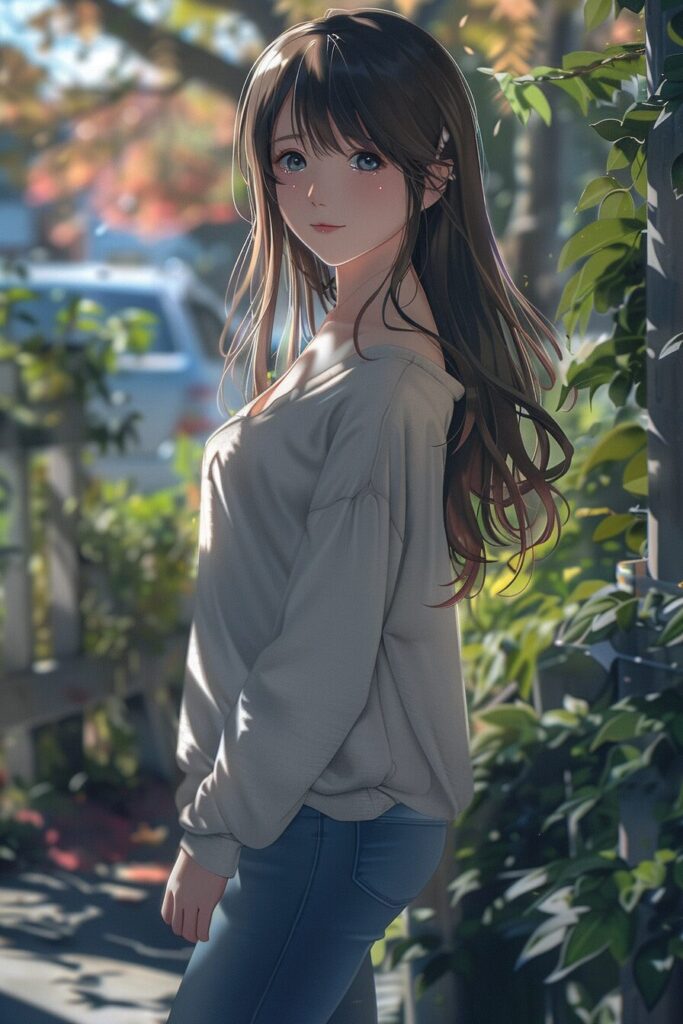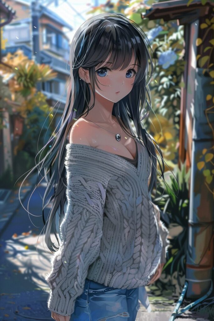 20-year-old Japanese beauty, (wide shot: 1.8), (beautiful:1.8), (Japanese: 1.4), (ultra detailed:2.0), (Cinematic fade: 1.1), (the whole body: 2.0), japanese anime image inspired by shinkai makoto, girl igray V-neck-sweater, long hair, blue eyes, cheerful, --ar 2:3