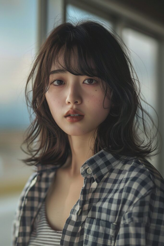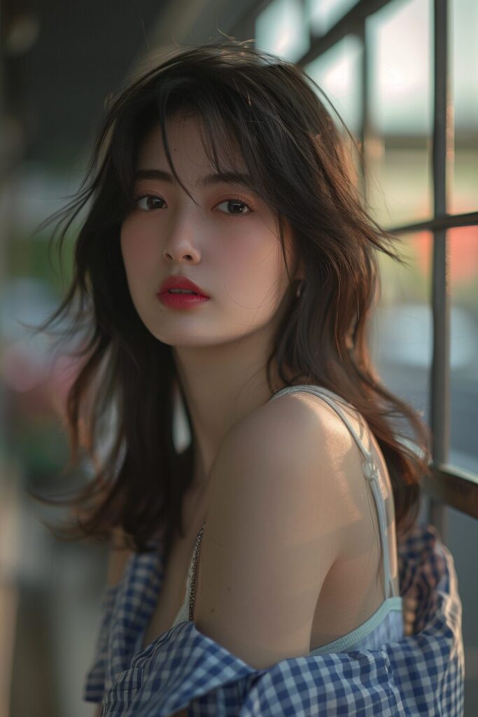 22-year-old Japanese beauty, (wide shot: 1.8), (beautiful:1.8), (Japanese: 1.4), (ultra detailed:2.0), (Cinematic fade: 1.1), (the whole body: 2.0), (bestquality,4k,8k,highres,masterpiece:1.2),ultra-detailed,(realistic,photorealistic,photo-realistic:1.37),selfie,(upper body),beautiful Japanese woman,wearing a checkered button-up shirt over a tank top,sad expression,talk room,early summer,cloudy sky,bokeh background, --ar 2:3