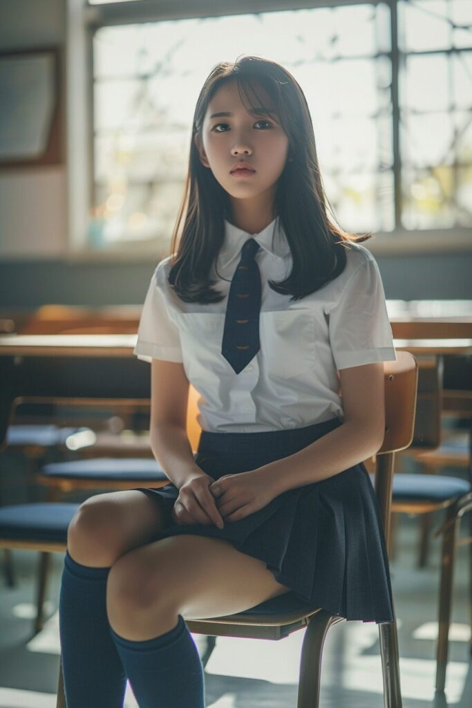 22-year-old Korean beauty, (wide shot: 1.8), (beautiful:1.8), (Japanese: 1.4), (ultra detailed:2.0), (Cinematic fade: 1.1), (the whole body: 2.0), Graceful young Japanese woman,17 years old,sitting chair,school uniform,no hands,focus on joints/connections,Short navy blue socks,nogizaka46, close-up shot of feet,only feet photo,feminine charm,high resolution,sun light,sunny day, --ar 2:3