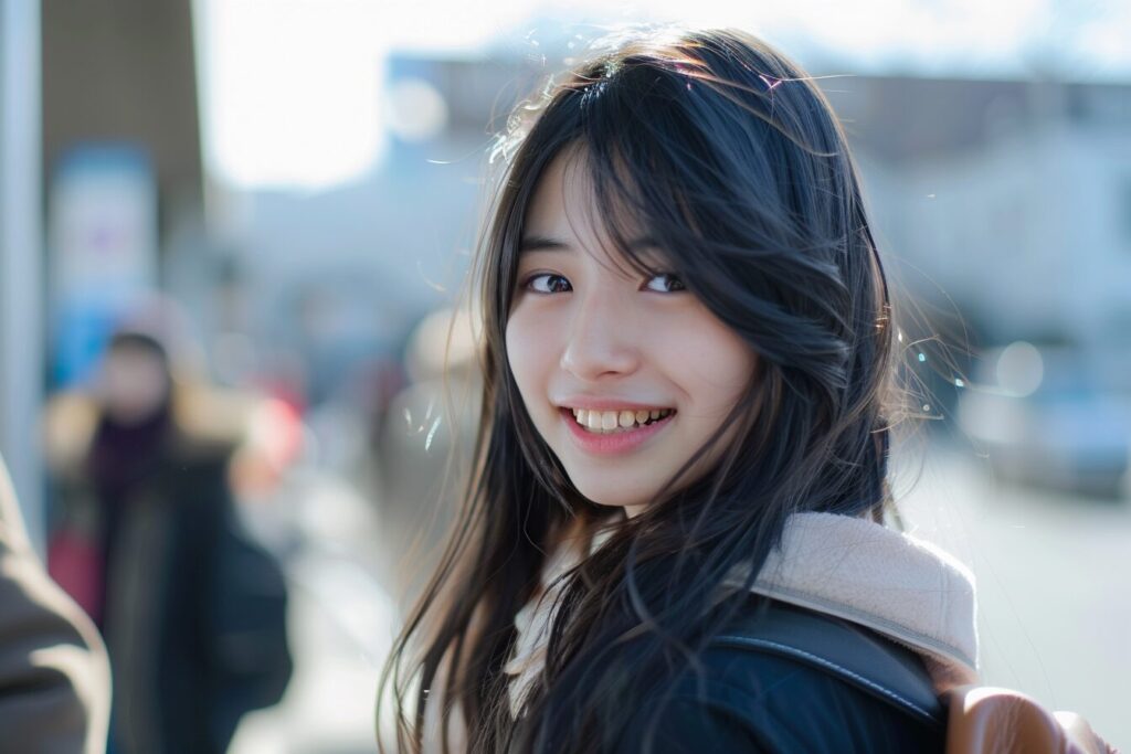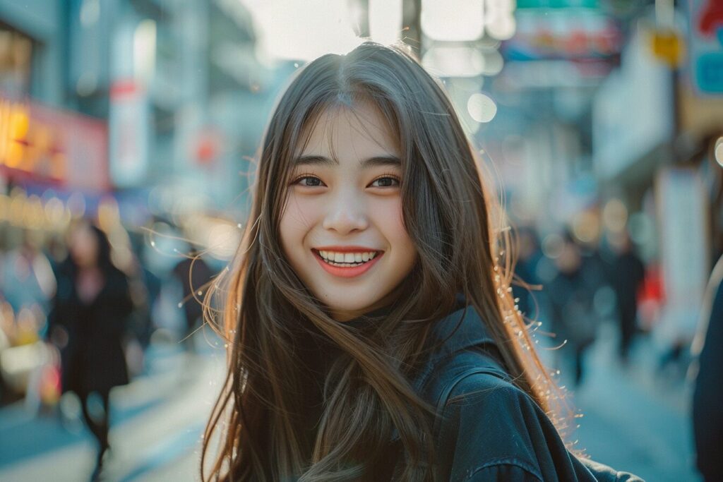 19-year-old Japanese beauty, (wide shot: 1.8), (beautiful:1.8), (Japanese: 1.4), (ultra detailed:2.0), (Cinematic fade: 1.1), (the whole body: 2.0), beautiful young asian girl on the street, smiling, in the style of tokina at-x 11-16mm f/2.8 pro dx ii, uhd image, salon kei, aurorapunk, shiny eyes, matte photo, zeiss batis 18mm f/2.8, --ar 3:2