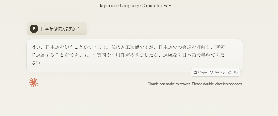 日本語が使えるか聞いてみましたが、2024年3月に発表された最新の「Claude 3」モデルは、現在159ヶ国で一般提供されています。日本語プロンプトにも対応しており、日本語で利用が可能です。