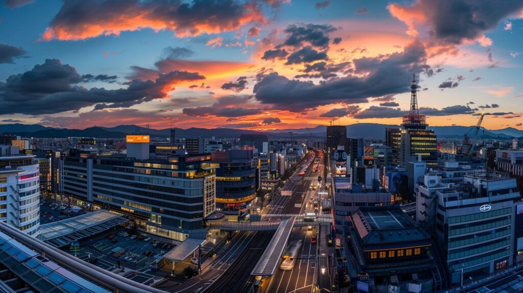 Panoramic view of the evening sky over Kyoto Station, Kyoto, Japan, taken from the roof of the tower, --ar 16:9