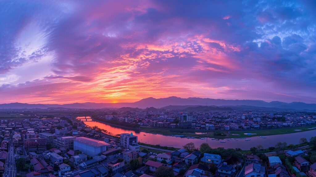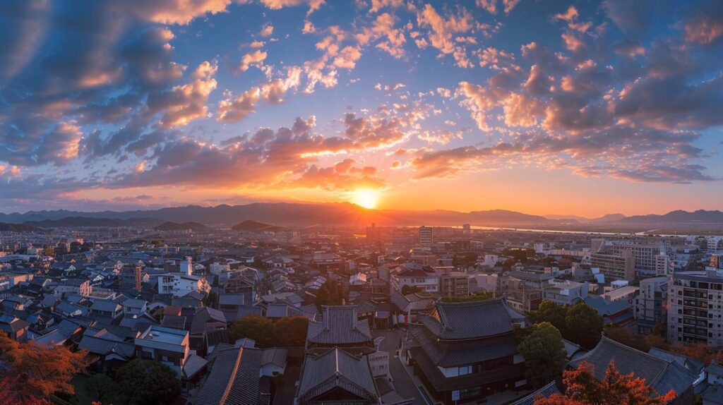 Panoramic view of the morning sky over Kirishima City, Kagoshima Prefecture, taken from the roof of the tower, --ar 16:9