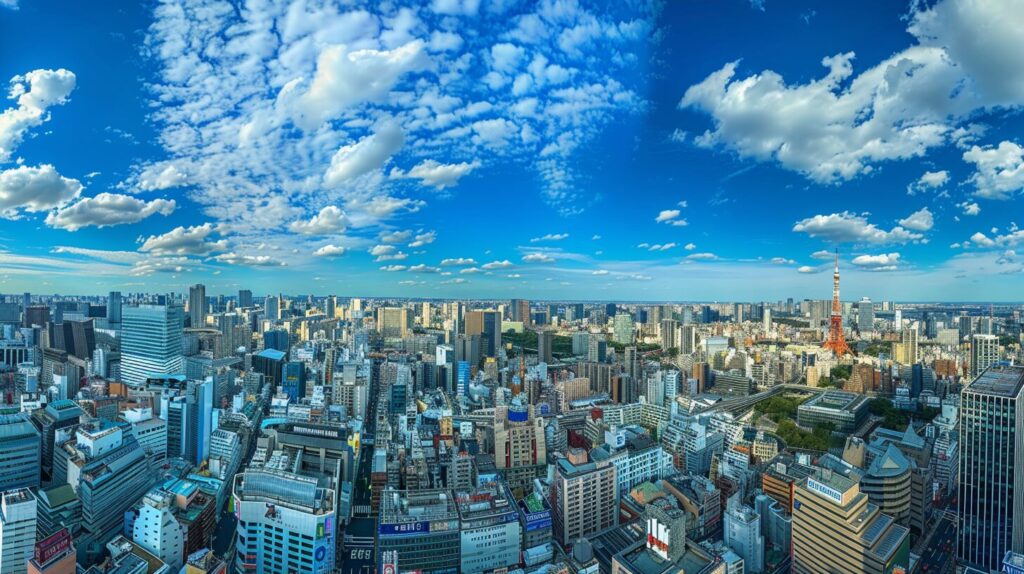 Panoramic view of the sky over Sendai, Miyagi Prefecture, taken from the roof of the tower, --ar 16:9
