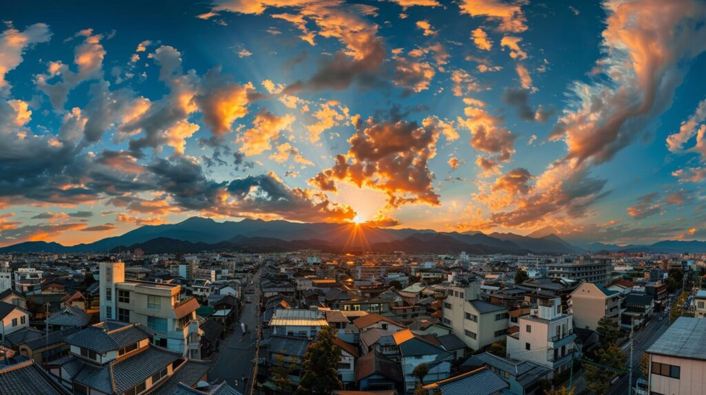Panoramic view of the sky over Matsumoto City, Nagano Prefecture, Japan, taken from the rooftop of the tower, --ar 16:9