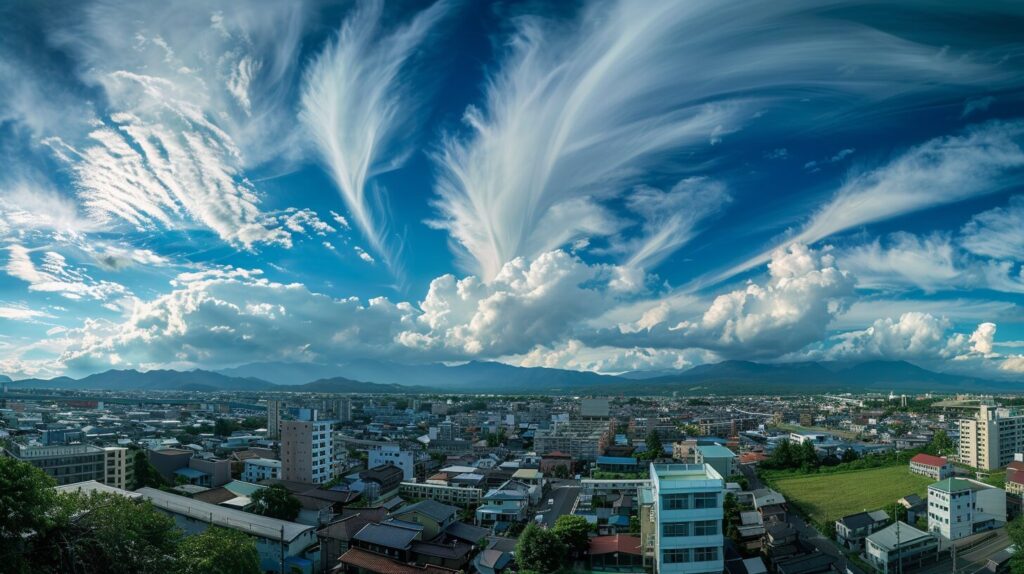 Panoramic view of the sky over Morioka, Iwate Prefecture, taken from the roof of the tower, --ar 16:9