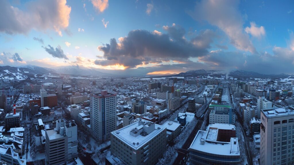 Panoramic view of the sky over Sapporo, Hokkaido, Japan, taken from the roof of the tower, --ar 16:9