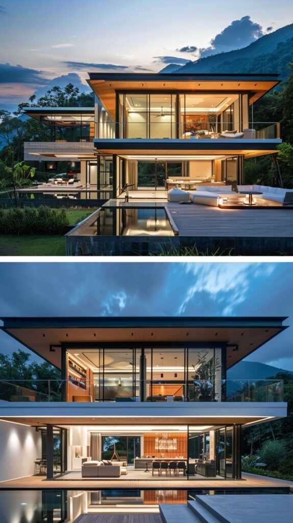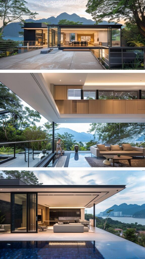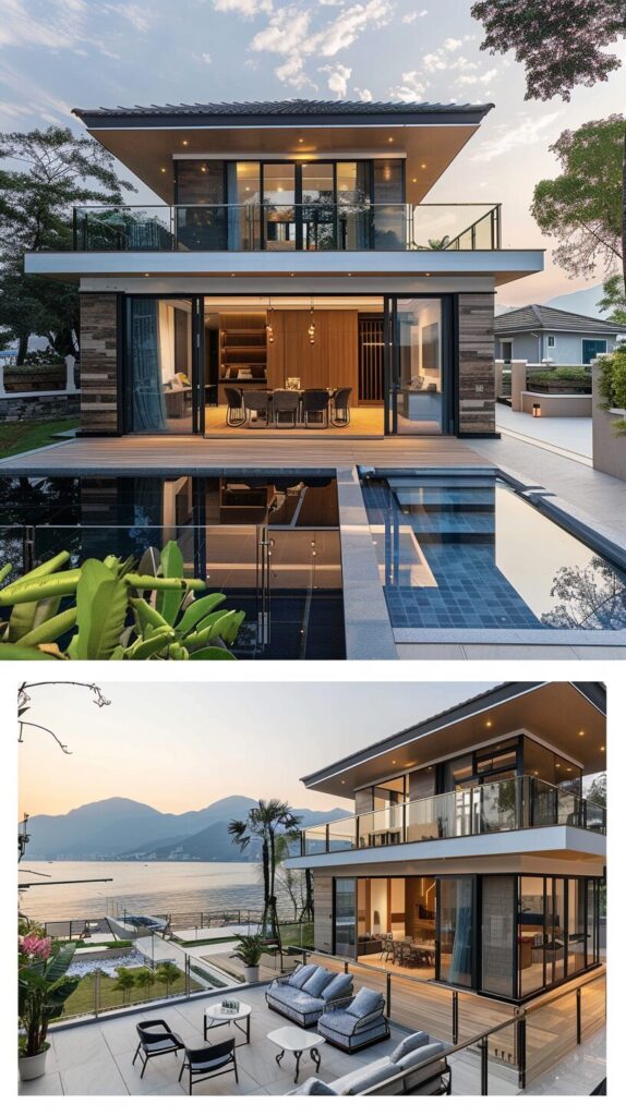 [bc8af6144] A two-story standalone villa with a floor area of 14.2 meters by 8.2 meters, featuring floor-to-ceiling glass windows and a roof with glass railings. The interior is designed with a modern minimalist style, including a living room and a leisure dining bar in the rooms. Outside, there is a waterfront platform, a swimming pool, and landscaped gardens, all offering breathtaking views of mist-covered mountains and the sea. --ar 9:16