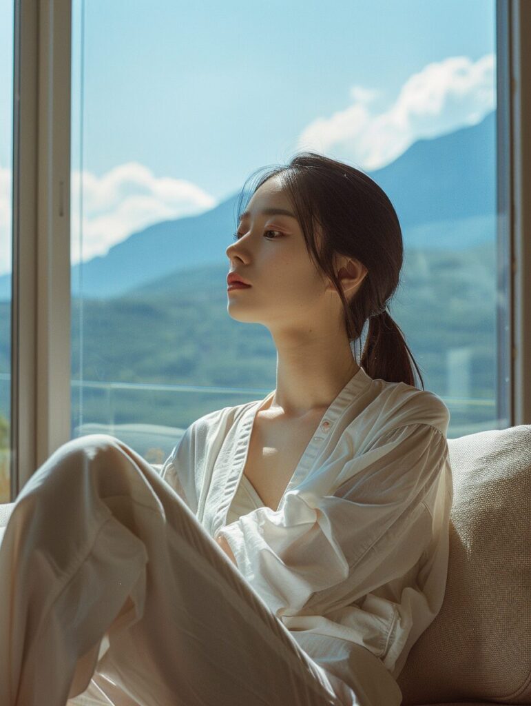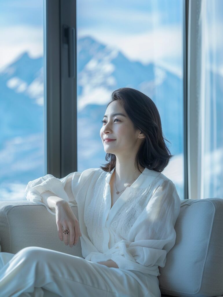 Panoramic view, right view, a Chinese woman sitting quietly on the sofa with a smile on her face, quiet and dignified. Outside the window, there are mountains and blue sky, and the environment is clean and bright. The indoor living room background is, right side view, Long view, full body, FullLength Shot, photography, 85mm Lens, F/16, bokeh, soft light, Volumetric light, Center the composition, High angle,Sony , --ar 3:4 --style raw