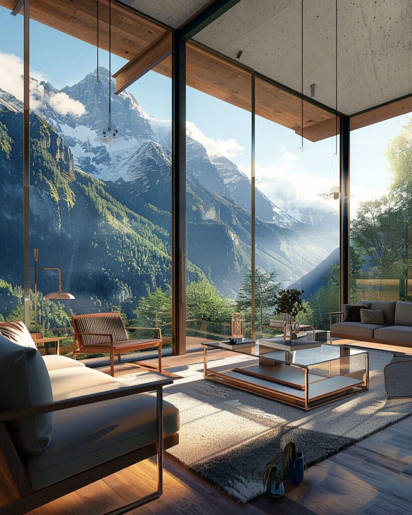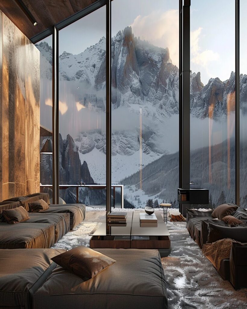 modern living room with glass walls overlooking the mountains, in the style of max rive, dreamlike naturaleza, heavy chiaroscuro --ar 51:64