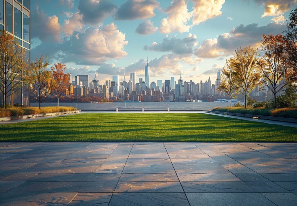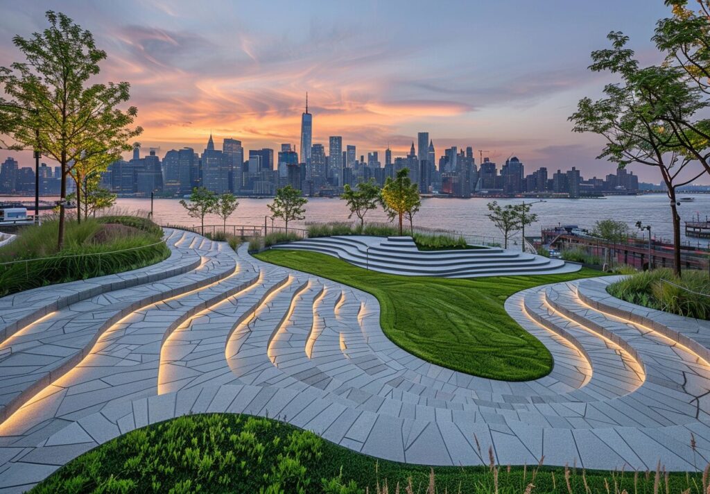 an urban plaza area with an empty lawn and a city skyline in the background, in the style of light installations, hudson river school, coastal views, playful use of line, golden light, tondo, concrete --ar 70:47 --stylize 250