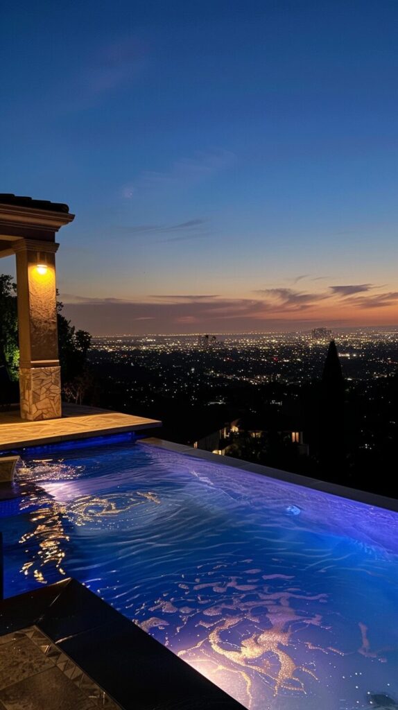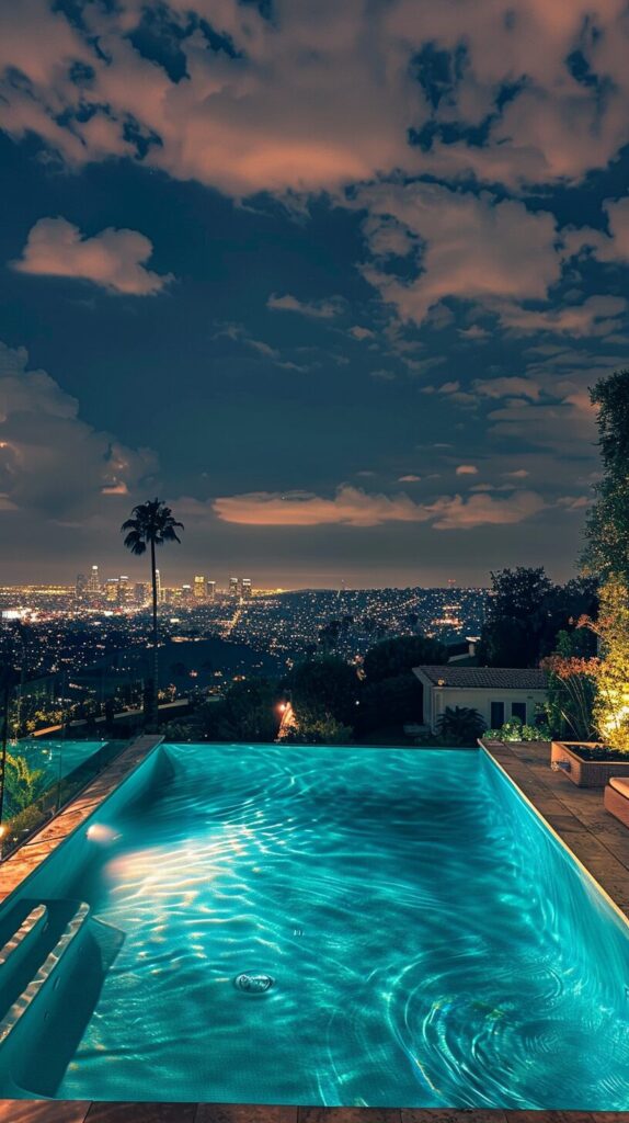 los angeles hills mansion, view from pool deck, city in the background, night time, iphone 12 photo --ar 9:16