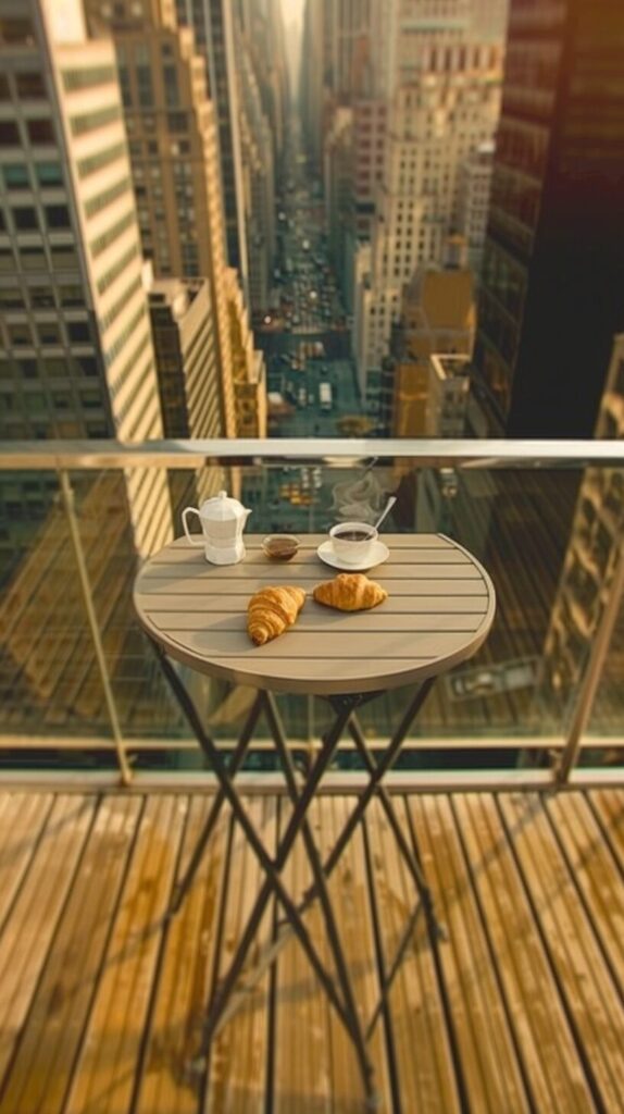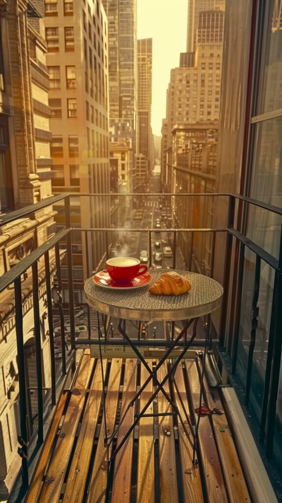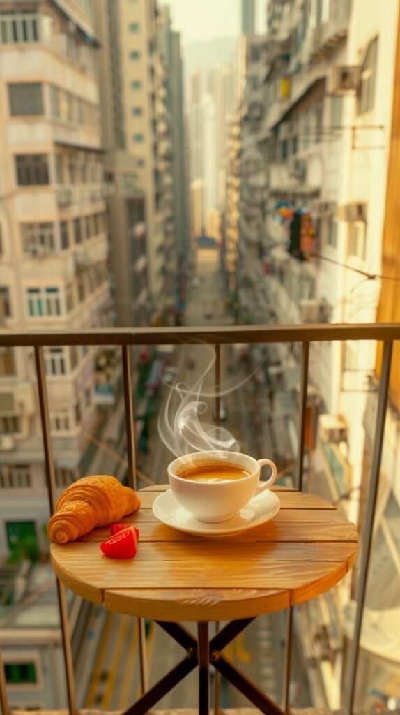 A photograph capturing a morning coffee scene on a balcony overlooking a bustling cityscape. The balcony, adorned with a small table and comfortable chairs, provides a serene spot amidst the urban environment. On the table, a steaming cup of coffee and a simple breakfast set, perhaps a croissant or fresh fruit, inviting the viewer to enjoy a peaceful morning moment. The background reveals a panoramic view of the city, with skyscrapers bathed in the soft, golden light of sunrise, signaling the start of a new day. The contrast between the tranquil balcony and the energetic city creates a dynamic and engaging composition. The lighting is key, highlighting the warmth of the morning sun and casting gentle shadows. Taken on: a digital camera, wide-angle lens to capture both the coffee scene and the cityscape, high-resolution to detail the city background, natural morning light for a soft, warm feel. --chaos 65 --ar 9:16 --stylize 200 --weird 2200