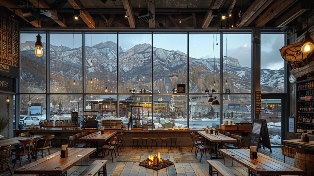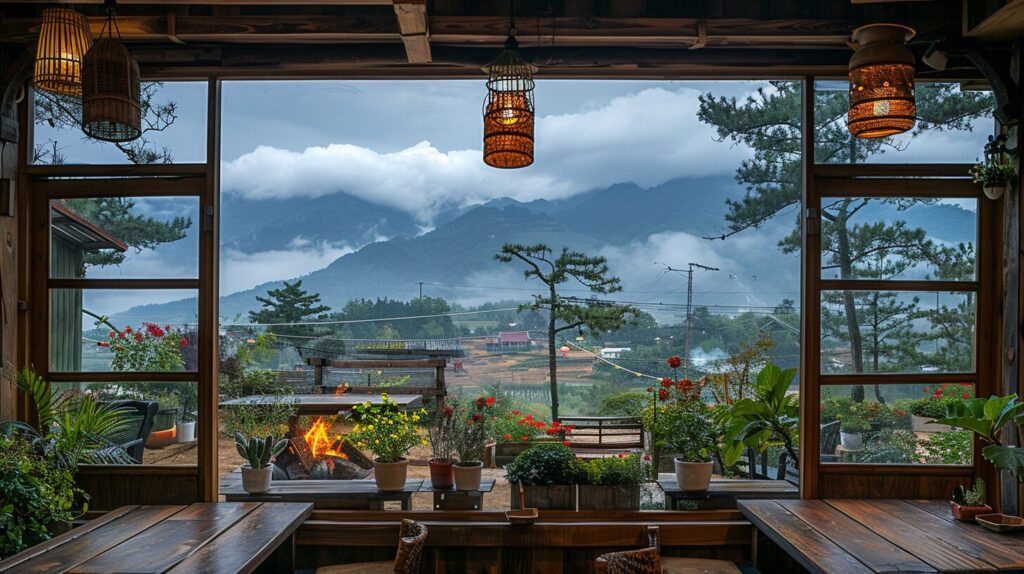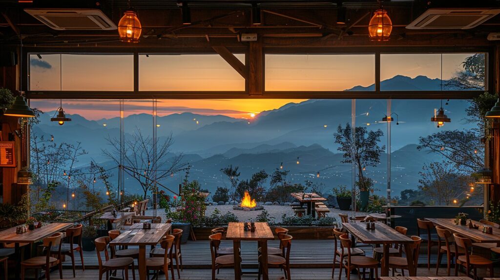 Mountain view through the window of a coffee restaurant, trendy American wooden tables and chairs and fire pit, rustic charm, joong keun lee, detailed architectural layout, rustic, eclectic, multi-layered --ar 16:9 --stylize 750