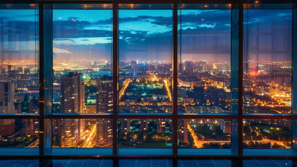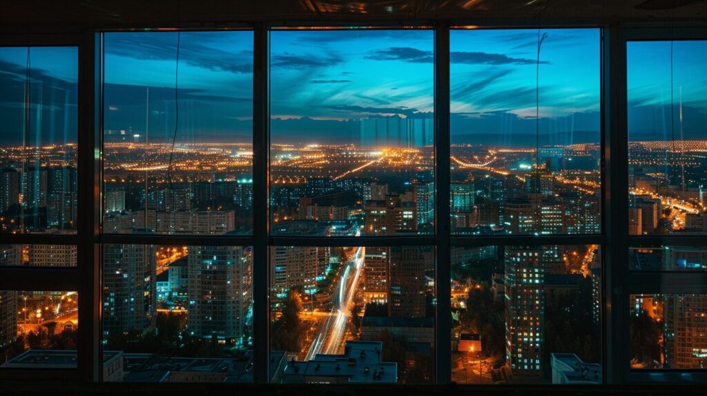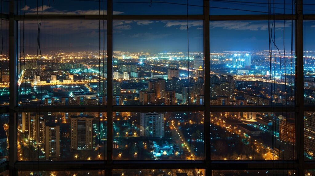 night almaty city landscape, view from big panoramic window from high building, realistic --ar 16:9