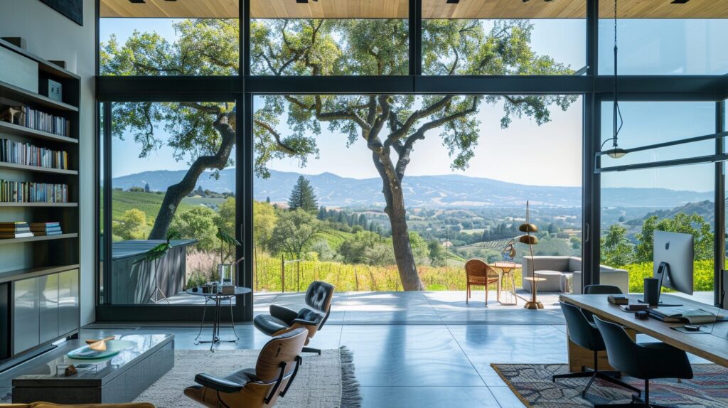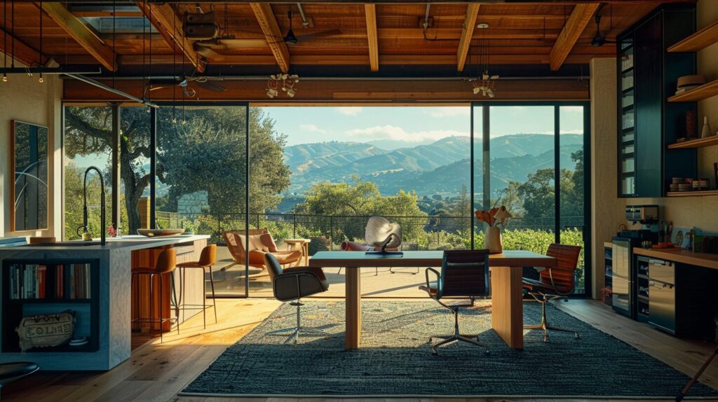 architectural photograph, hi-tech Artist studio, with view of the Napa Valley, Hasselblad X1D, f/2.8 --ar 16:9 --style raw