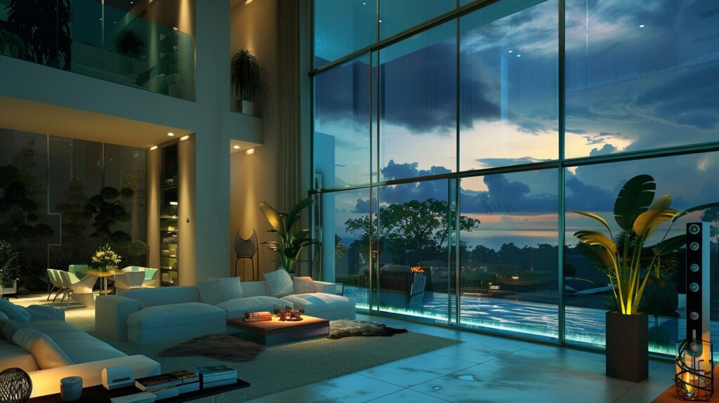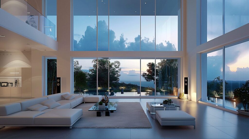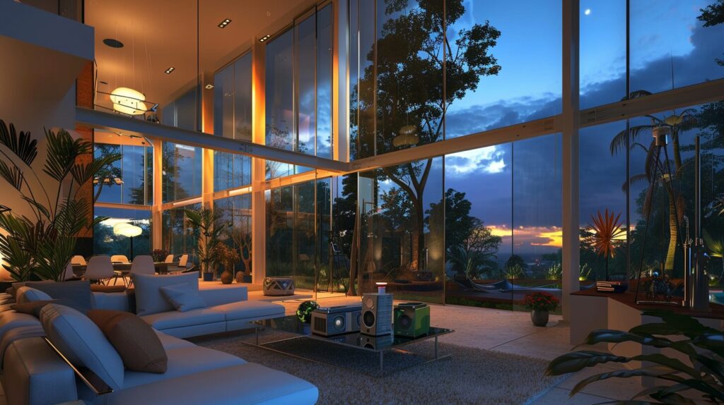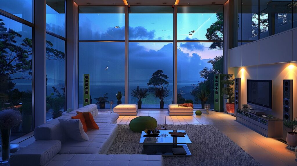 [Italian post Modern] Laxury living room featuring Gorgeous living room with vaulted 10m high ceilings to the second floor, wide vertical windows with stunning views, White expensive pop modern design funitures with colorful color accents. And green tall wireless audio speakers and silver audio system organized. Large glass windows, open space, integration with nature and minimalist aesthetic facing in dark amazon rainforest, The room is located on a hill, window show extremely large trees and dense forest far to the holizen, from hill top view. at During the early evening in winter season, The sky has a dark gradient of twilight colors, where the sun has already sink and soft light and the moon and stars on the sky, the cool deep blues light of night, ground are covered plants and small flowers. --ar 16:9 --style raw