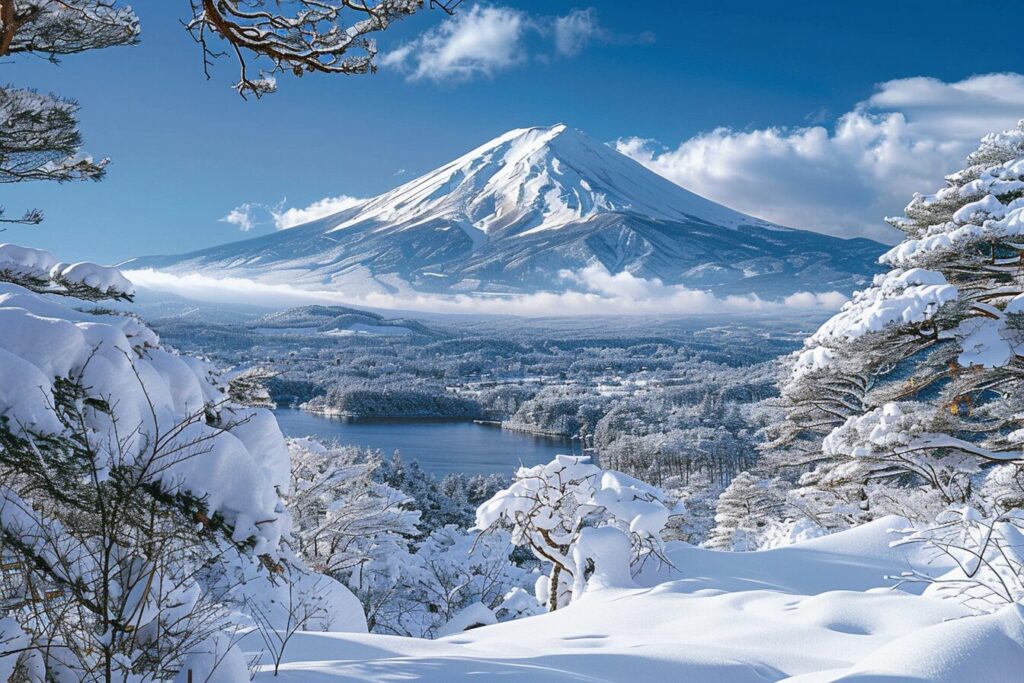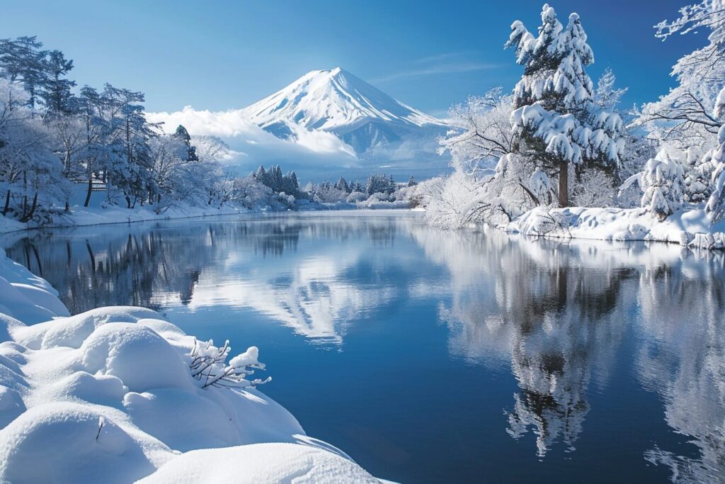 A magazine-style snapshot of a snow-covered Mount Fuji, focusing on the elegance of the winter scenery for a feature on seasonal natural beauty --ar 3:2 --stylize 200