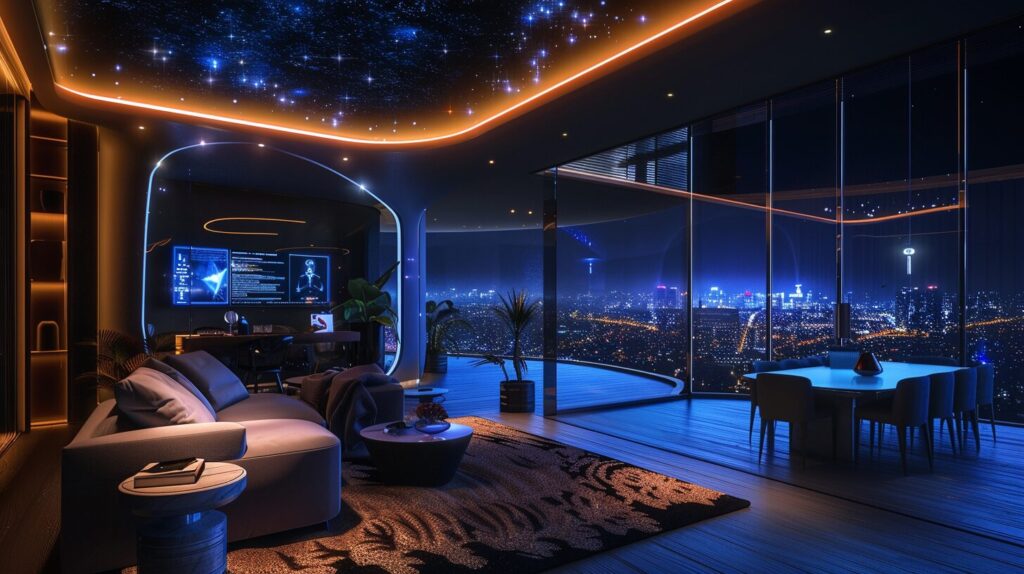 Envision an ultra-realistic image of a state-of-the-art futuristic apartment, where augmented reality and AI smart home technology blend seamlessly into the living space, captured with the unmatched clarity of a Phase One XF IQ4 camera, which boasts an extraordinary resolution of 150 Megapixels and a sensor size of 53.7 x 40.4 mm. This apartment is perched high above a sprawling metropolis, with floor-to-ceiling windows offering a panoramic view of the city's neon skyline. Inside, sophisticated AR interfaces float above minimalist, high-end furniture, displaying interactive holographic controls for environmental adjustments, entertainment systems, and virtual communication with lifelike detail. Advanced, adaptive LED lighting is integrated into the structure, casting a soft, dynamic glow that reacts in real-time to the inhabitants' movements and mood. The materials used throughout the apartment are of the highest quality, with surfaces that showcase the intersection of luxury and futuristic design. Textures are rendered with an unparalleled level of detail, from the reflective sheen of smart glass surfaces to the subtle weave of designer fabrics, all illuminated by a lighting scheme designed to enhance the space's ultra-modern aesthetics. The contrast between the vibrant, tech-driven interior and the serene, starlit cityscape outside is captured with a dynamic range that brings out the lush details and deep shadows, creating an immersive, hyper-realistic scene that exemplifies the pinnacle of luxury living in the future --ar 16:9