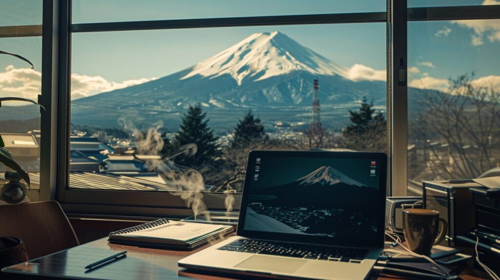 I was sitting in a hotel with a spectacular view of Mt. Fuji from a fairly large window, and the angle of view was such that I could see Mt. Fuji through the window while I was sitting in a chair with steaming coffee and my Macbook placed on the side of the view. There was a notebook and a pen, making it look like I was working on a computer. --ar 16:9