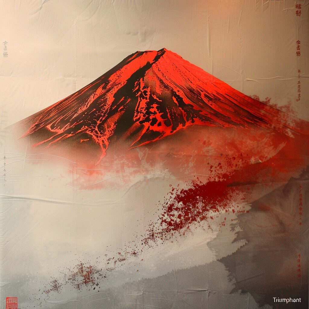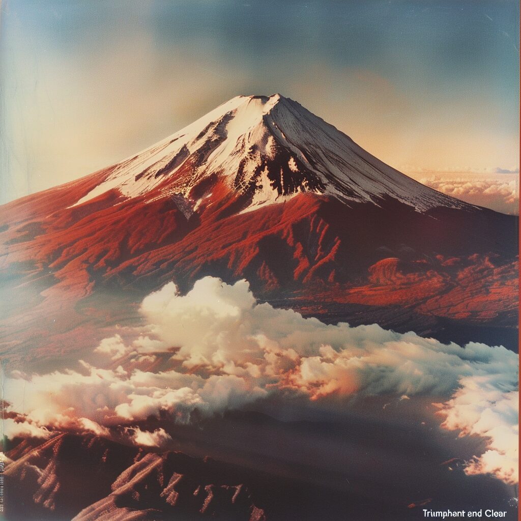 Surreal,Red Fuji in Fugaku Sanjurokkei "Triumphant and Clear" taken from an angle directly above ma with 120mm, bird’s-eye view --ar 1:1