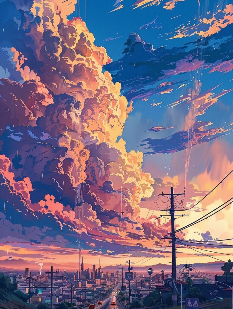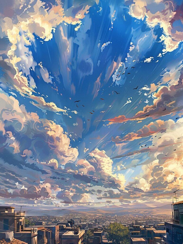 an image of the sky over a city, in the style of anime art, painterly lines, desertwave, i can't believe how beautiful this is, hyper-detailed, lively landscapes, hikecore --ar 3:4