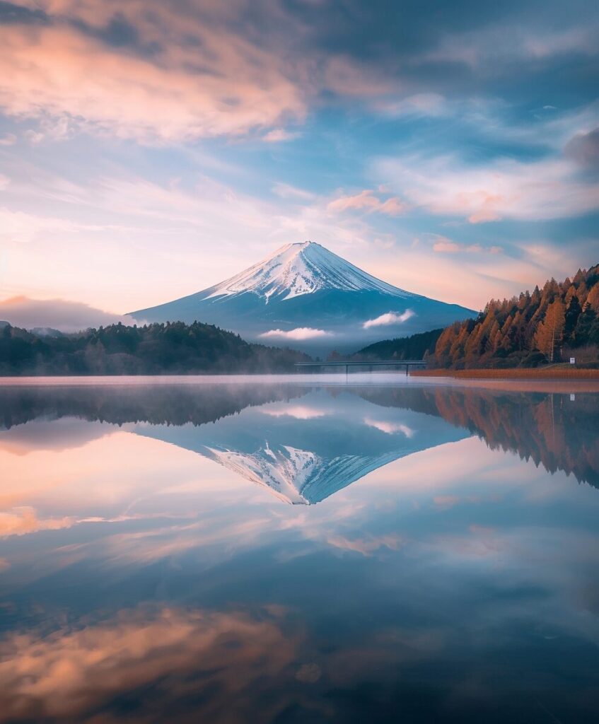 the famous mt fuji in a lake reflected on the water, in the style of michael shainblum, spectacular backdrops --ar 53:64 --stylize 50