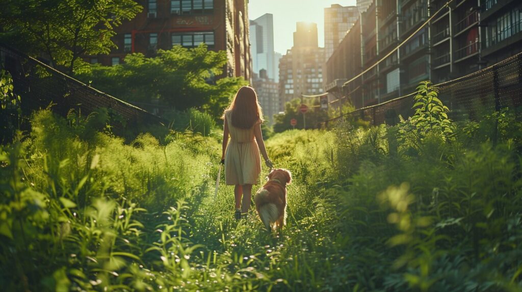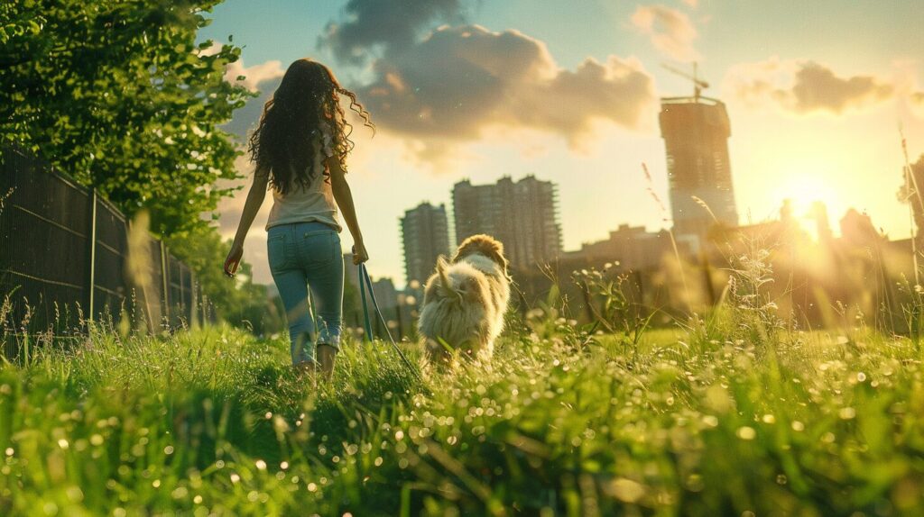 使用したプロンプトはこちら▼ <prompt> Unveil the urban magic! Amidst city passages, a girl and her dog walk through an unexpected green meadow. Witness the genuine joy on the woman's face and the boundless happiness of her canine companion / professional photography / color / light tone 8k --ar 16:9