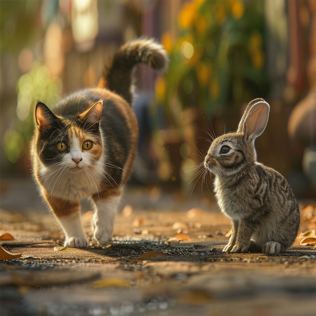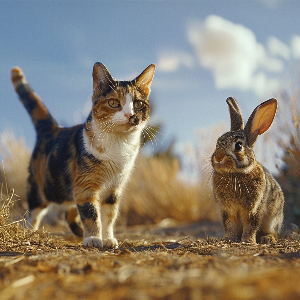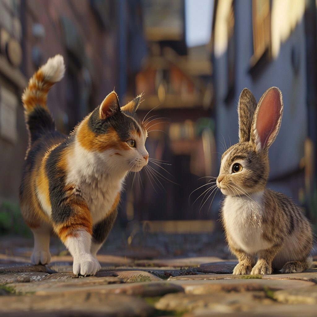 使用したプロンプトはこちら▼ <prompt> A calico cat walking towards the left side of the frame, and an adorable bunny facing the right side, both in full body view, constitute the composition of the movie poster
