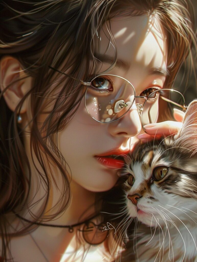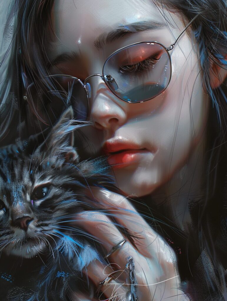 使用したプロンプトはこちら▼ <prompt> A 20-year-old Korean girl, with long hair, cool expression, wearing sunglasses and holding a lovely cat in her hand,close-up, masterpiece expression 8k ultra-detailed picture quality, exquisite picture, rich details, thick paint style, animation aesthetics Star troupe style ,Thick acrylic illustration --ar 3:4