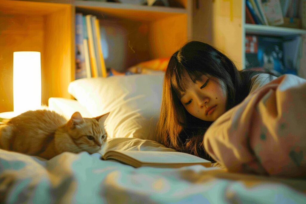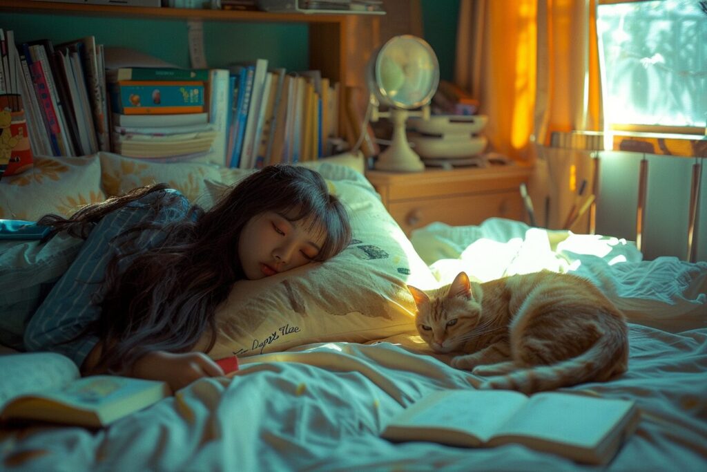 使用したプロンプトはこちら▼ <prompt> A diligent 17-year-old Taiwanese high school girl with luxurious hair intently studies in her multifunctional room, a fusion of a cozy bedroom and a well-organized study. Her study nook, a cluster of books and notes, contrasts with the inviting softness of her bed, while a serene British Shorthair cat in shades of yellow lounges nearby. Photographed by Dorothea Lange, using a Leica SL2 with a Summilux-SL 50mm f/1.4 ASPH lens, utilizing a combination of natural light and a subtle fill light to highlight the duality of her life. --ar 3:2
