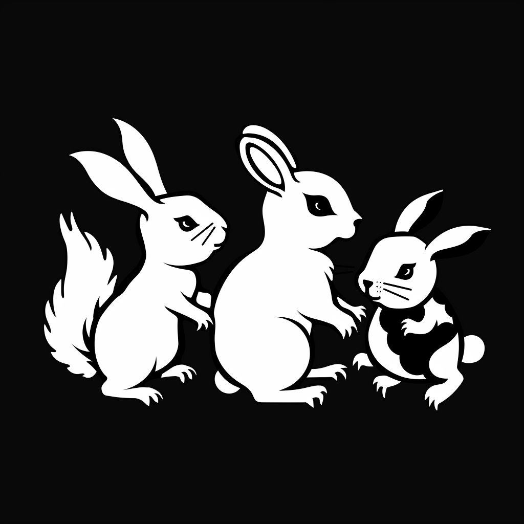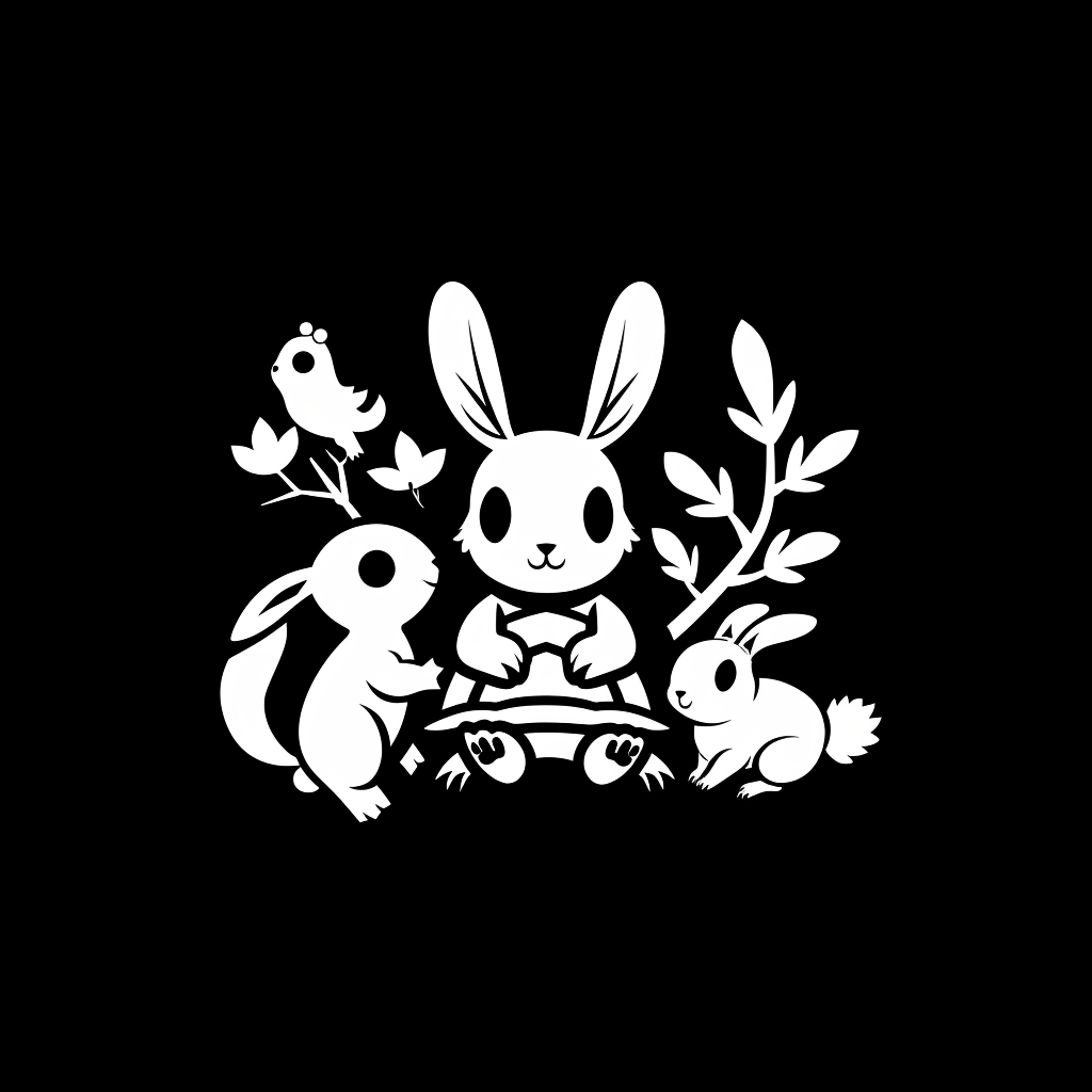 使用したプロンプトはこちら▼ <prompt> Design a LOGO, black background, white symbol, concise, group of woodland creatures, style kiwi cute, like a bunny, a squirrel, and a turtle, all preparing for war. --stylize 50