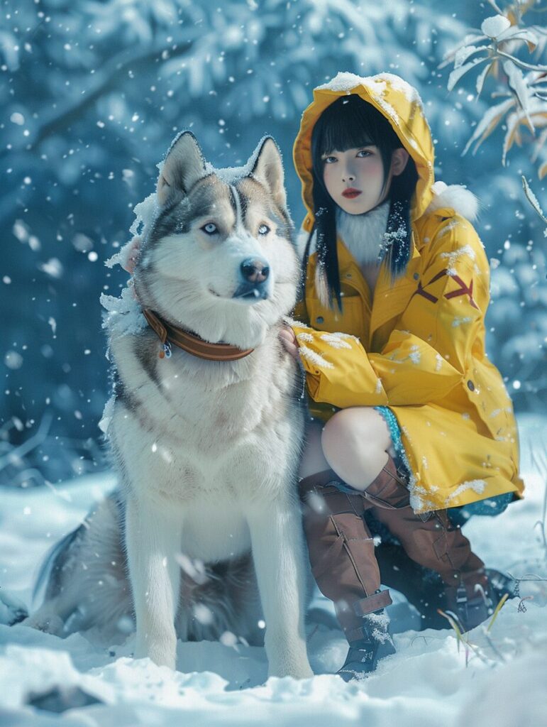 使用したプロンプトはこちら▼ <prompt> a girl with a gigantic dog toying with his body, in the style of photorealistic portraiture, charming anime characters, xu beihong, snow scenes, yellow and azure, zeiss planar t* 80mm f/2.8, ad posters --ar 3:4 --stylize 50
