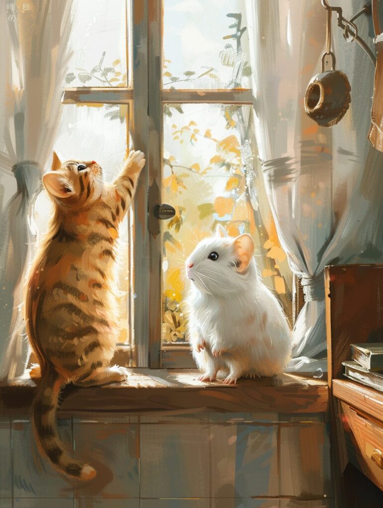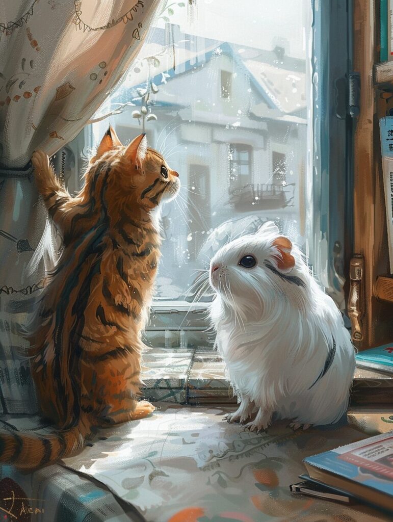 使用したプロンプトはこちら▼ <prompt> Beside the bay window, a tiger-striped British Shorthair is climbing up the curtain, while a white guinea pig sits nearby watching. The guinea pig, with big eyes, snow-white fur, a pink nose and mouth, has a plump and cute head that is incredibly adorable and beautiful. The backdrop is a bright room, with walls made of white tiles, furnished with a sofa, a table, and a light brown cabinet. There are a few books on the table --ar 3:4 --stylize 250