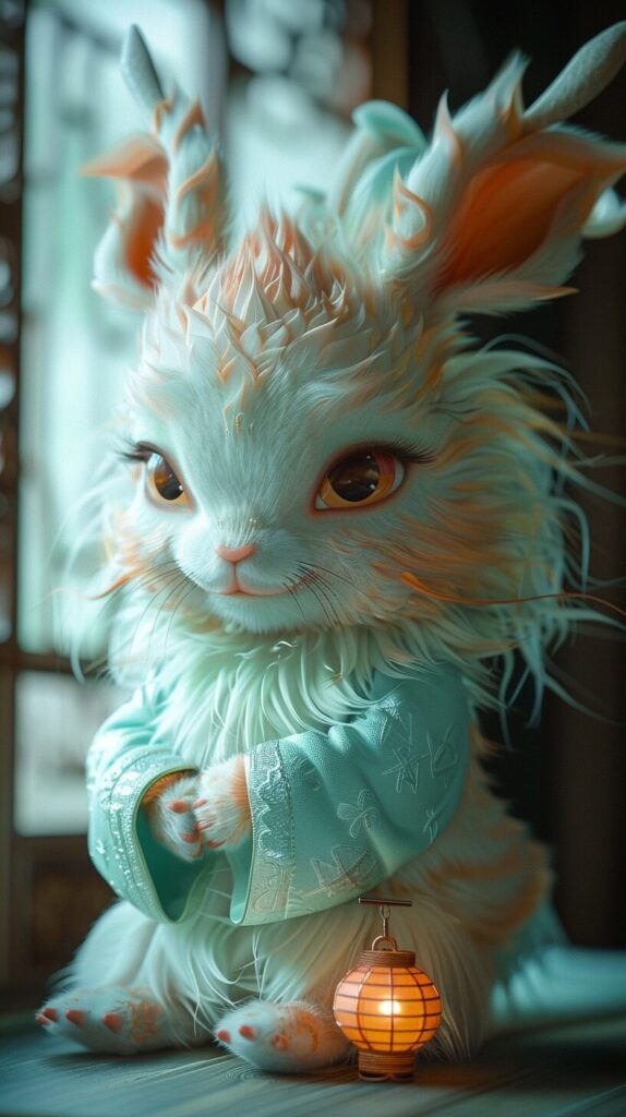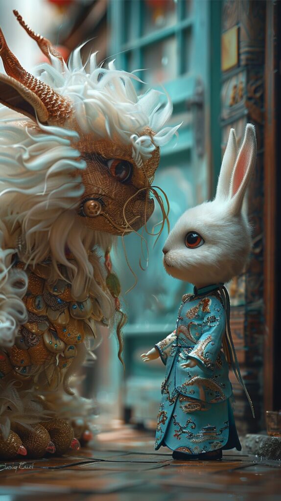 使用したプロンプトはこちら▼ <prompt> a big head fat furry Chinese dragon shack hands with a big white bunny,on a mint background, full body shot,in the style of disney animation, bill gekas, realistic genre scenes, soft sculptures, colorful animation stills, movie poster --ar 9:16 --style raw --stylize 650