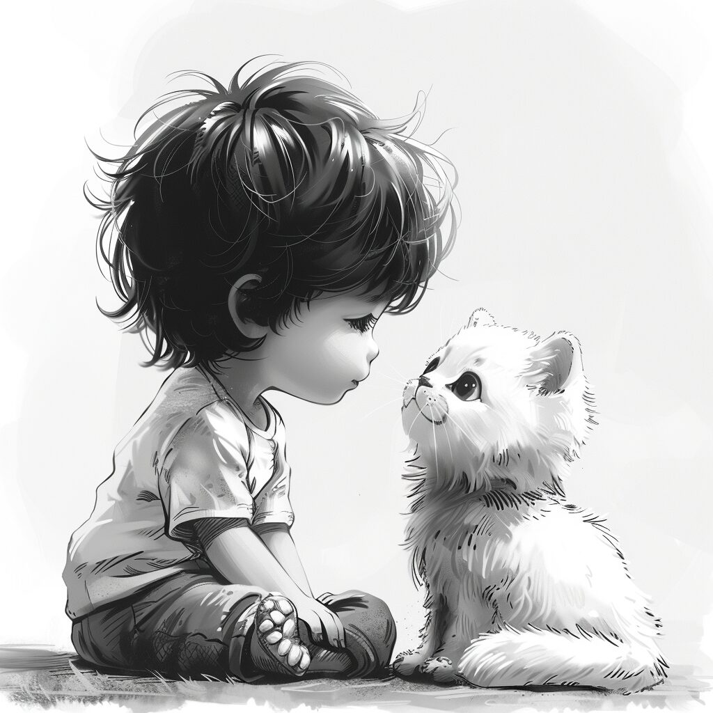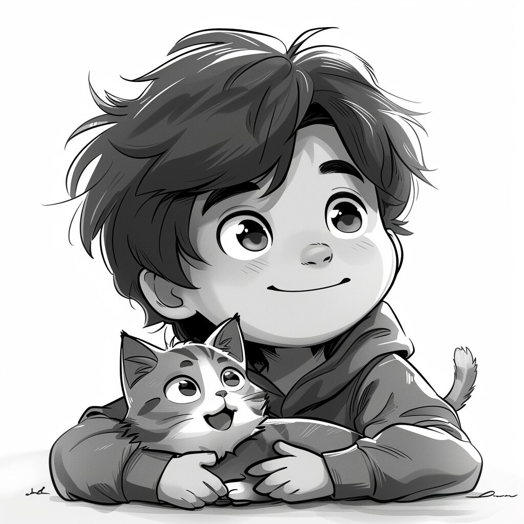 使用したプロンプトはこちら▼ <prompt> black white line, a boy with his cat, simple cartoon style, --ar 1:1 --stylize 750
