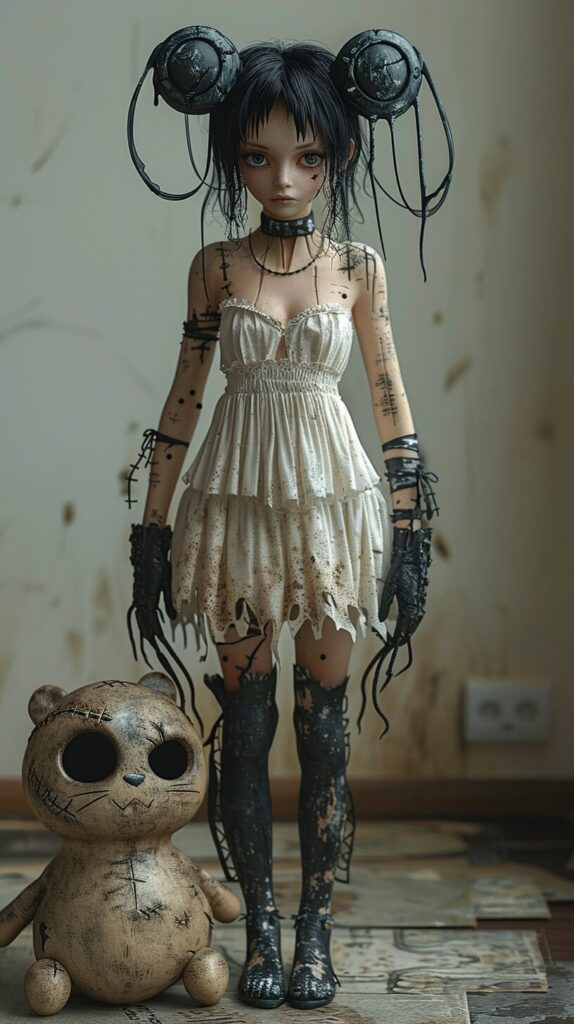 使用したプロンプトはこちら▼ <prompt> ((In the texture of 80s Japanese comic printed on paper, black and white, two-tone monochrome, ultra-detailed jaggy black lines, no antialiasing)), BREAK ((full body)), a 3D photorealistic figure of coquettish girl, standing with a scary stuffed animal in one hand, BREAK wearing white gothic dress, choker, black enamel gloves, high heel, looking at the viewer. --ar 9:16 --stylize 750