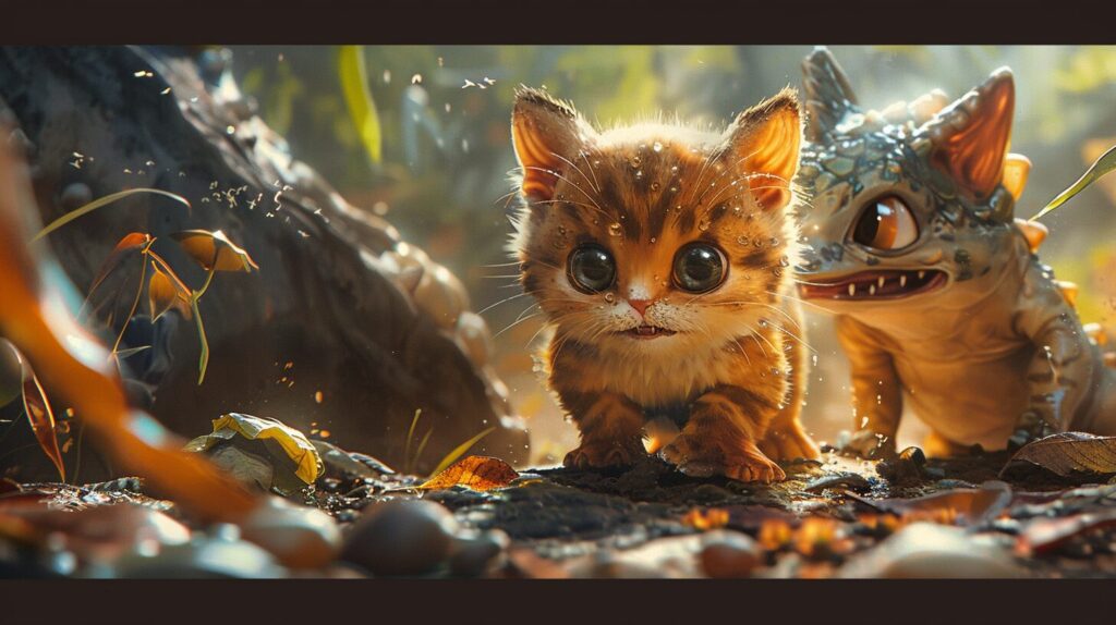 使用したプロンプトはこちら▼ <prompt> Game poster. Pokémon style. A cute kitten with a smooth dinosaur body, a big belly, and a pitiful expression. A ferocious monster is watching it from behind, drooling. --ar 16:9 --stylize 250