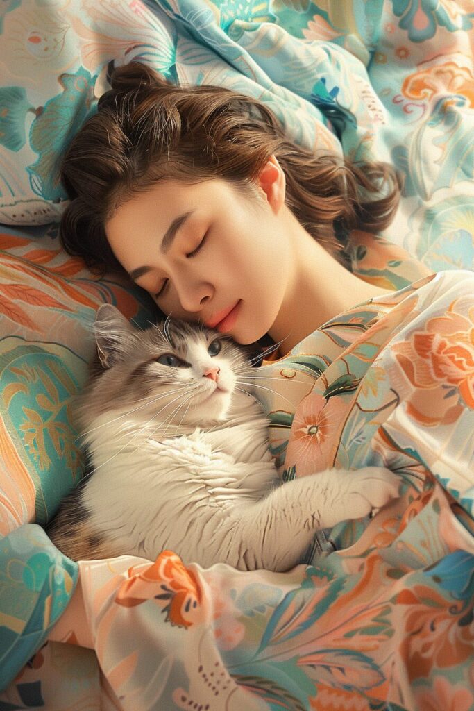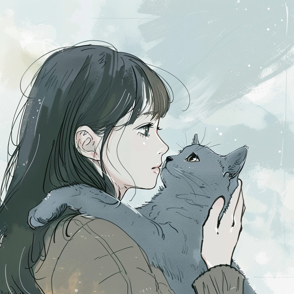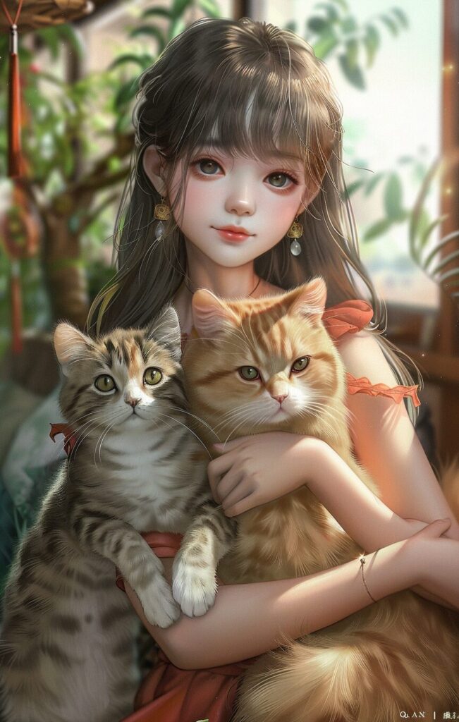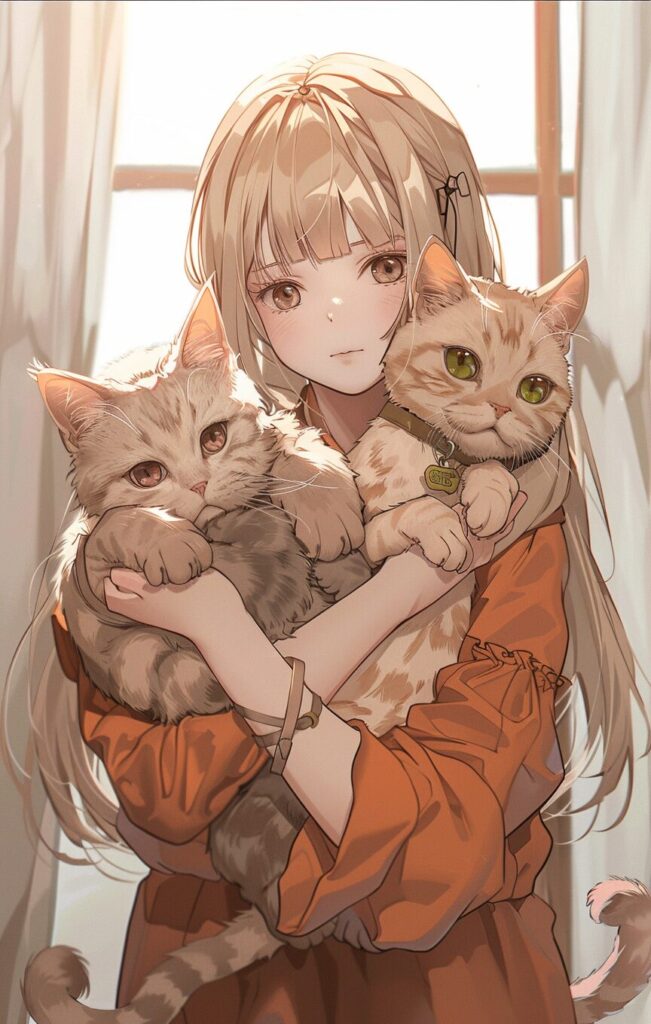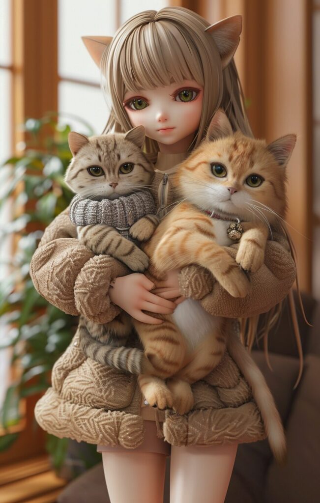 使用したプロンプトはこちら▼ <prompt> full body,An anime girl is holding a British Shorthair, with two small cats lying on the left and a golden-furred cat with green eyes on the right. Presented in exquisite realism, ZBrush, and Qian Xuan's style, featuring a light brown color palette and fawncore essence. The depiction captures lifelike figures --ar 81:128