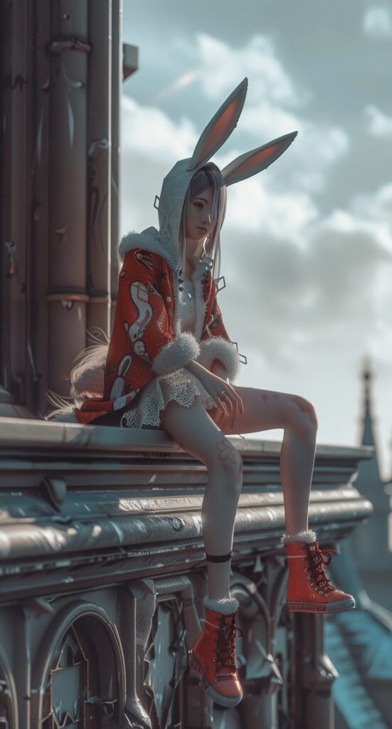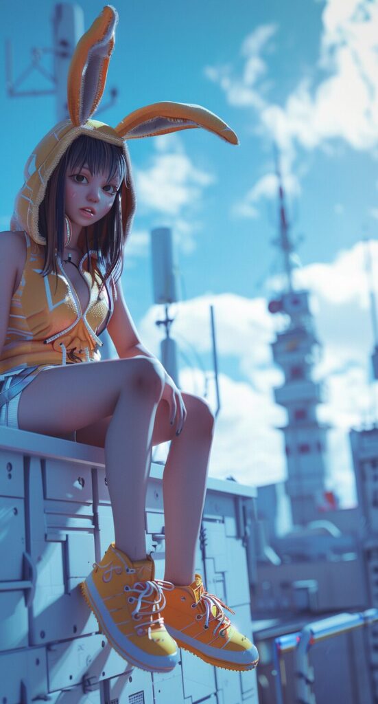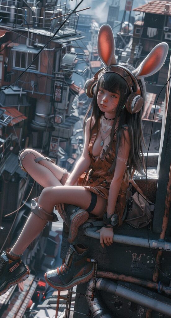 使用したプロンプトはこちら▼ <prompt> a girl in bunny ears sits on a building and wears a rabbit costume, in the style of vray tracing, animecore, violet and brown, qiu shengxian, highly realistic, , ocean academia --ar 69:128