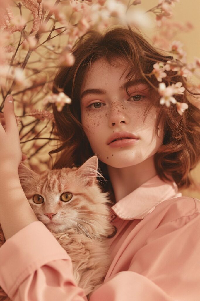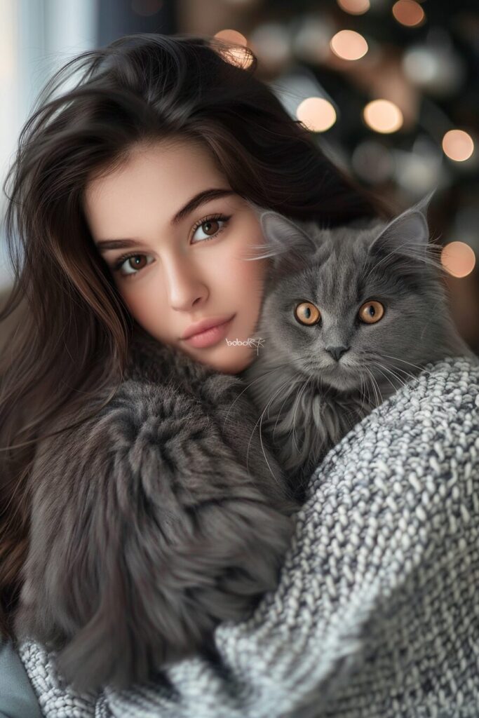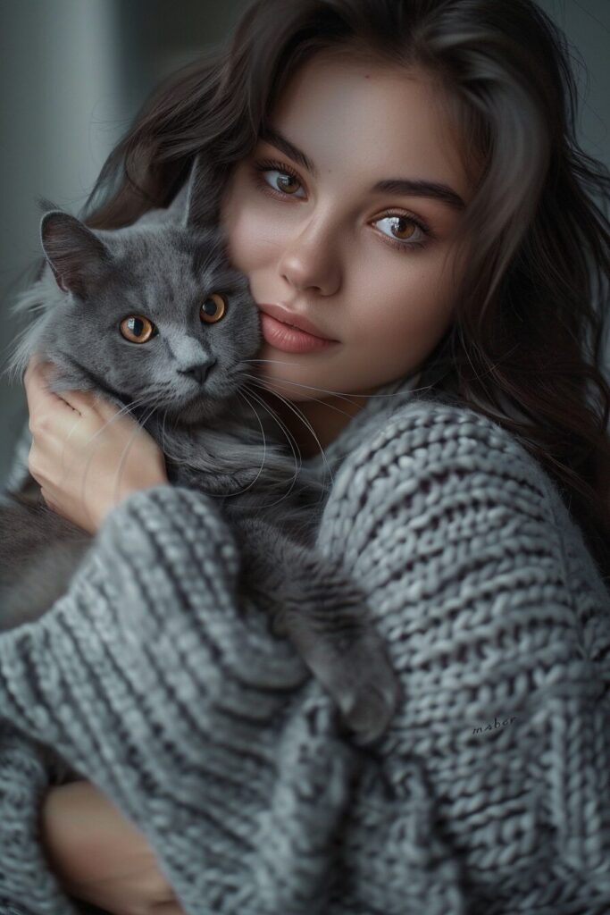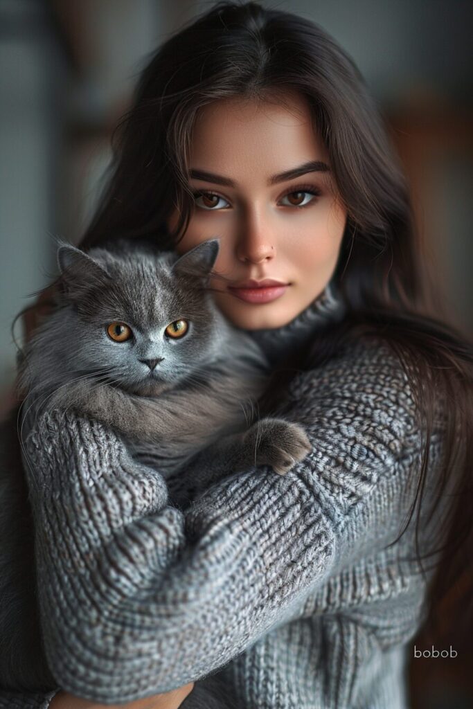 使用したプロンプトはこちら▼ <prompt> Realistic photo portrait of a beautiful dark-haired brown-eyed girl - high cheekbones, brown eyes, long hair in "bob" style. She is holding a gray fluffy cat in her arms. She herself is dressed in a cozy soft Maher gray sweater. This is a gorgeous photo - the clothes are clearly visible. Both the woman and the cat are looking into the frame. It's as if it's a shot from a romantic movie, the evening soft light, realism and high detail --ar 2:3 --style raw