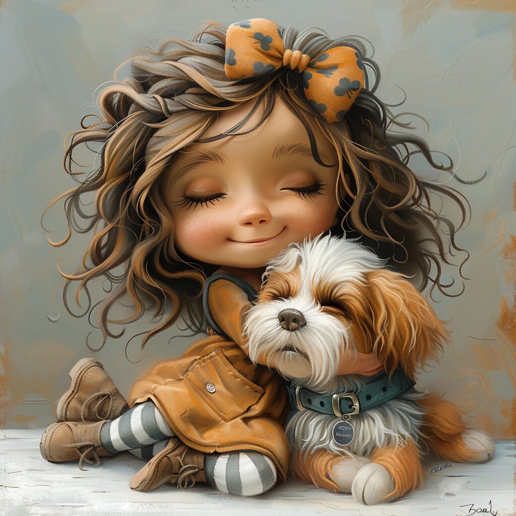 使用したプロンプトはこちら▼ <prompt> cartoon funny funny cute dog , with curly hair with a shiny bow , in a menthol T-shirt with blueberries , skirt with pockets, striped tights and shoes with clasps , hugging a big dog ,white background, oil watercolor, high quality, airbrushing ,3D --stylize 750