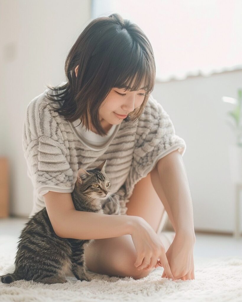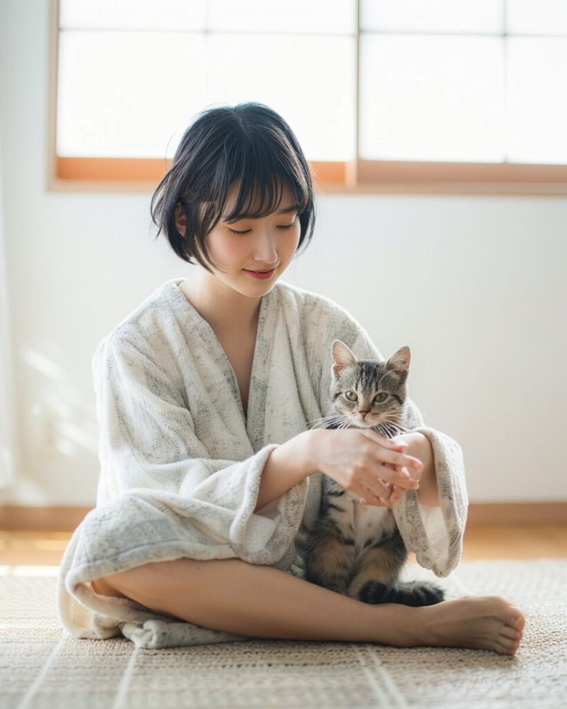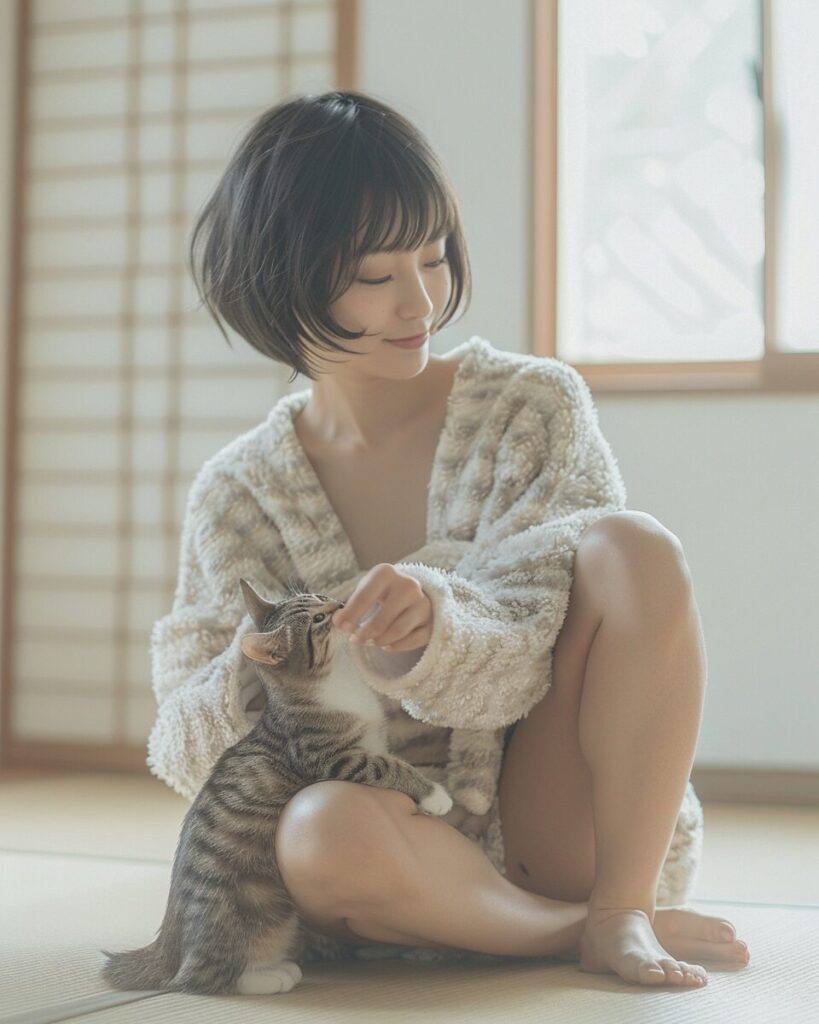 使用したプロンプトはこちら▼ <prompt> A beautiful, young, slender Japanese woman with a sharp and well-defined jawline, radiating glamour, captured in a real-life photograph. She is inside a spacious, bright white house, dressed in a fluffy loungewear and shorts. Sitting on the tatami floor in seiza position, she gently strokes a small cat with a smile on her face. Her hair is styled in a chic short cut, enhancing her pure and charming beauty. All of this is captured in a photograph, showcasing her loveliness., wide angle lens, --ar 4:5