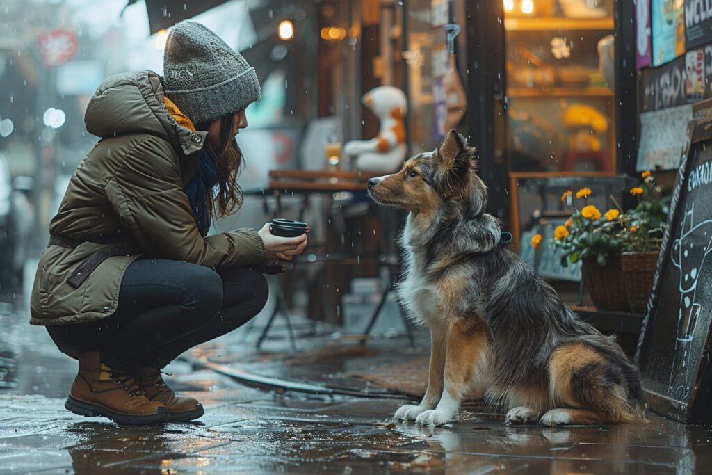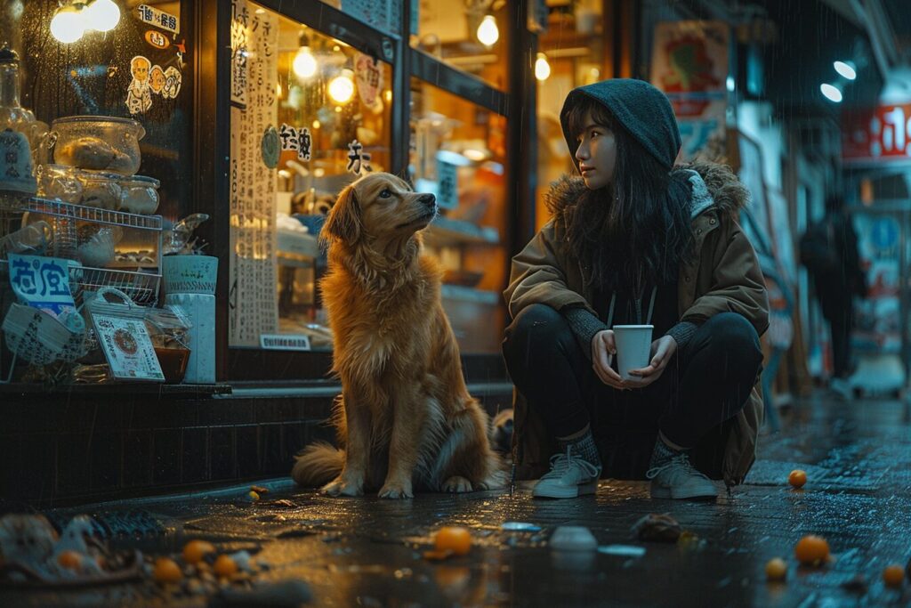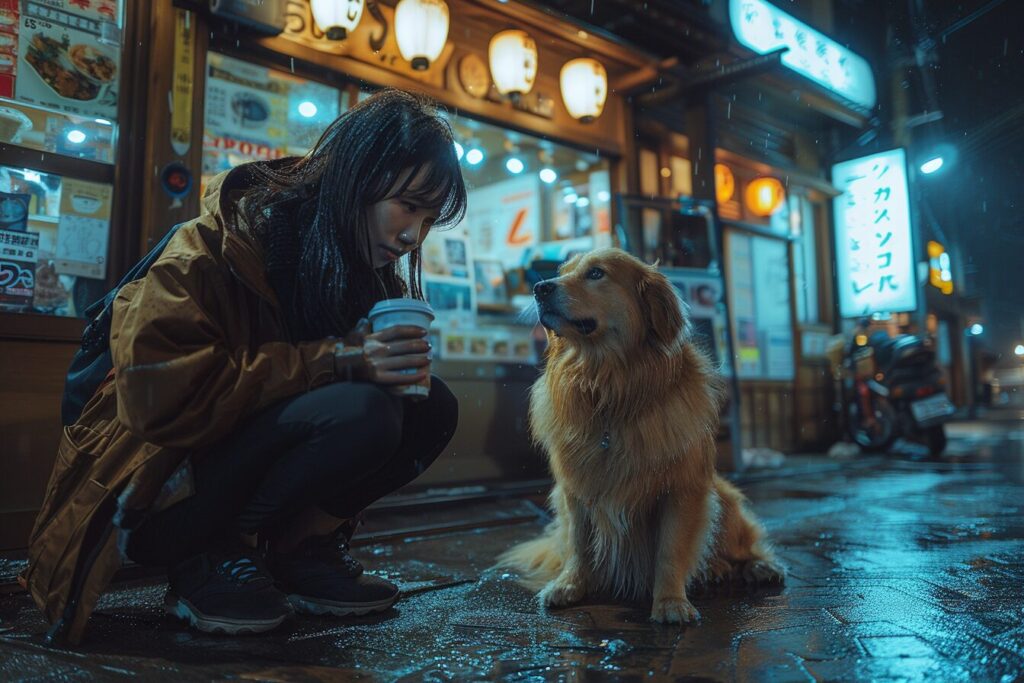 使用したプロンプトはこちら▼ <prompt> wide-angle view of a girl holding coffee squatting and playing with a dog outside a shop at night, urban lifestyle, street photography --ar 3:2 --stylize 750
