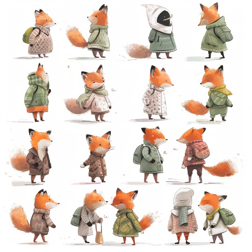 使用したプロンプトはこちら▼ <prompt> Cute animal wearing clothes, for a childrens book, different angles, character sheet, soft colors, illustration inspired by Ryo Takemasa, Jon Klassen, Eric Carle; all sides; white background ; all expressions; walking away; view from behind; view from back